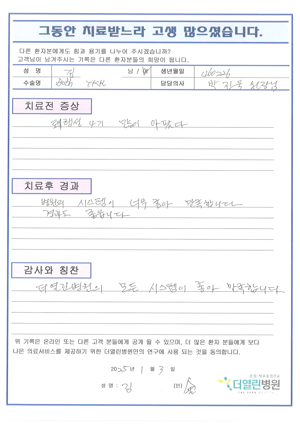 양측 무릎 인공관절치환술 페이지 정보 작성자 관리자 댓글 0건 조회 16회 작성일 26-03-05 14:17 본문 목록 이전글양측 무릎 인공관절치환술 26.03.05 다음글절제 생검 및 골피질부위 제거술 및 항생제함유 골시멘트 삽입술 26.02.05 댓글목록 댓글목록 등록된 댓글이 없습니다.