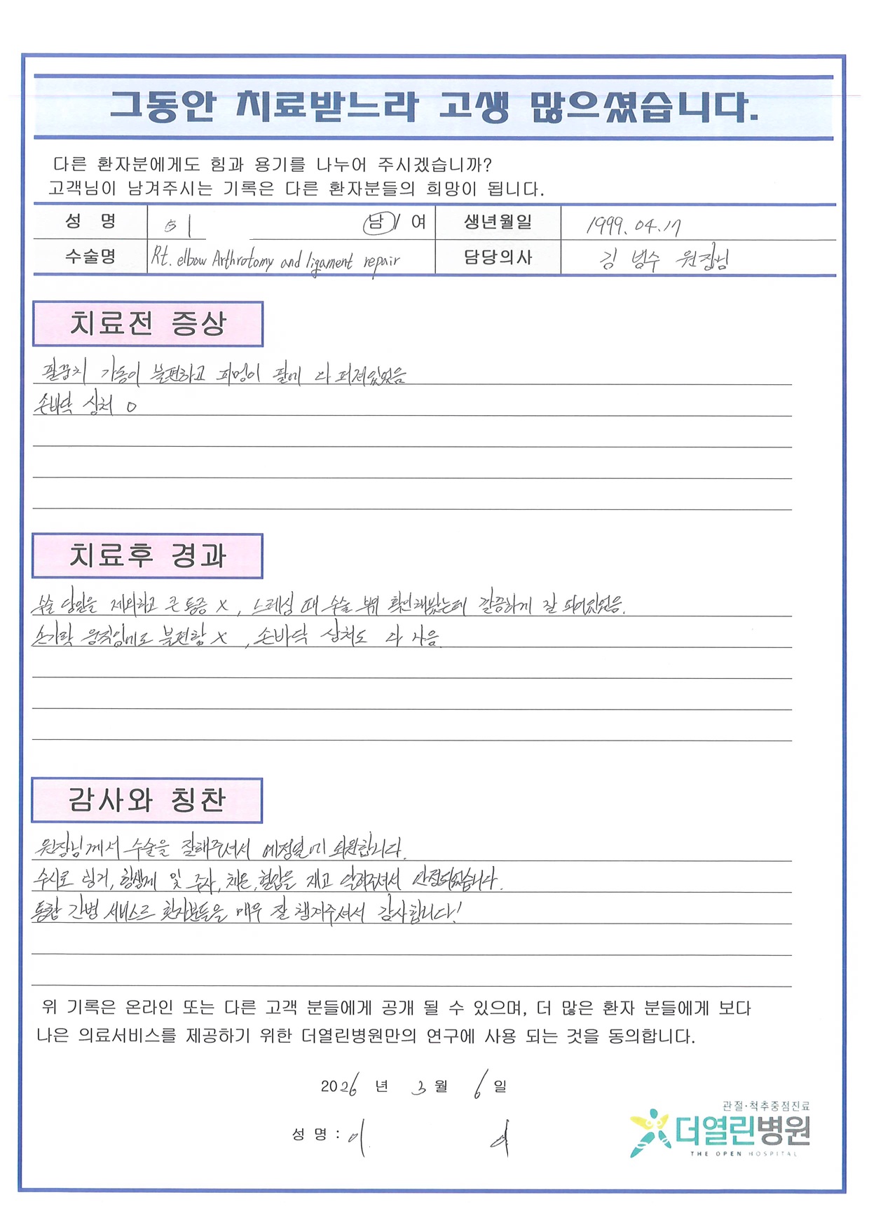 우측 팔꿈치 외측 측부인대 봉합술 페이지 정보 작성자 관리자 댓글 0건 조회 2회 작성일 26-04-07 11:16 본문 목록 이전글양측 무릎 인공관절치환술 26.04.07 다음글우측 슬개골 관혈적 정복술 및 금속와이어링 고정수술 26.04.07 댓글목록 댓글목록 등록된 댓글이 없습니다.