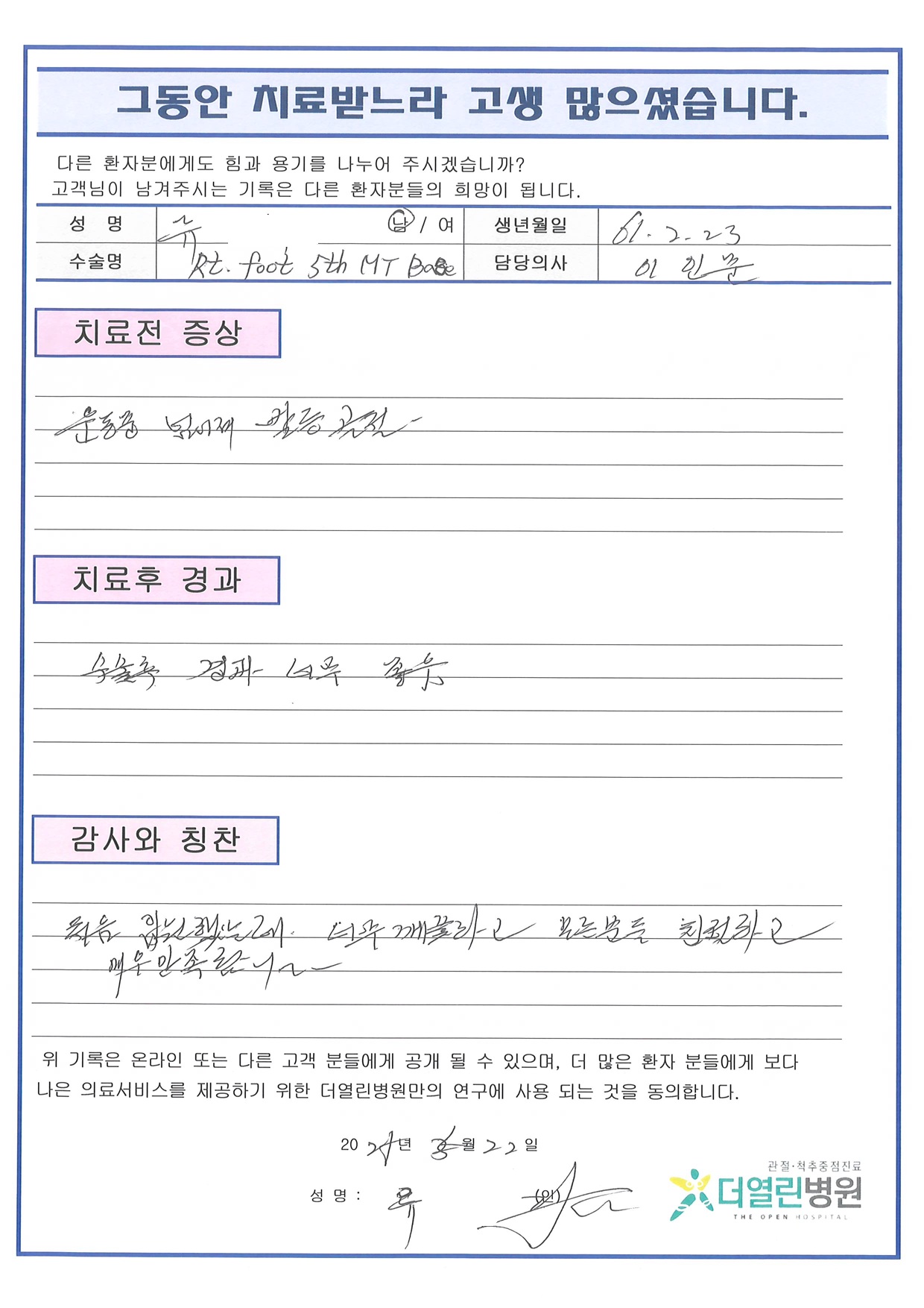 우측 발 비관혈적 정복술 및 내고정술 페이지 정보 작성자 관리자 댓글 0건 조회 155회 작성일 25-06-07 09:20 본문 목록 이전글양측 무릎 인공관절치환술 25.07.02 다음글우측 무릎 관절경하 소파술 및 반달연골부분절제술 25.06.07 댓글목록 댓글목록 등록된 댓글이 없습니다.
