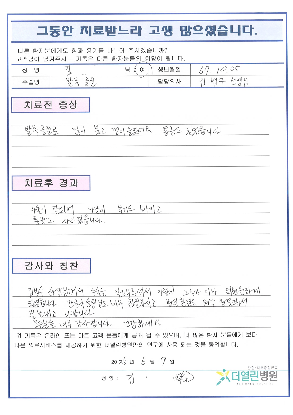 좌측 발목 외복사뼈 관혈적 정복술 및 금속판 고정술 페이지 정보 작성자 관리자 댓글 0건 조회 72회 작성일 25-07-02 15:07 본문 목록 이전글좌측 발목 관혈적 정복술 및 금속판 고정술 25.07.02 다음글좌측 반월상연골절제술 25.07.02 댓글목록 댓글목록 등록된 댓글이 없습니다.