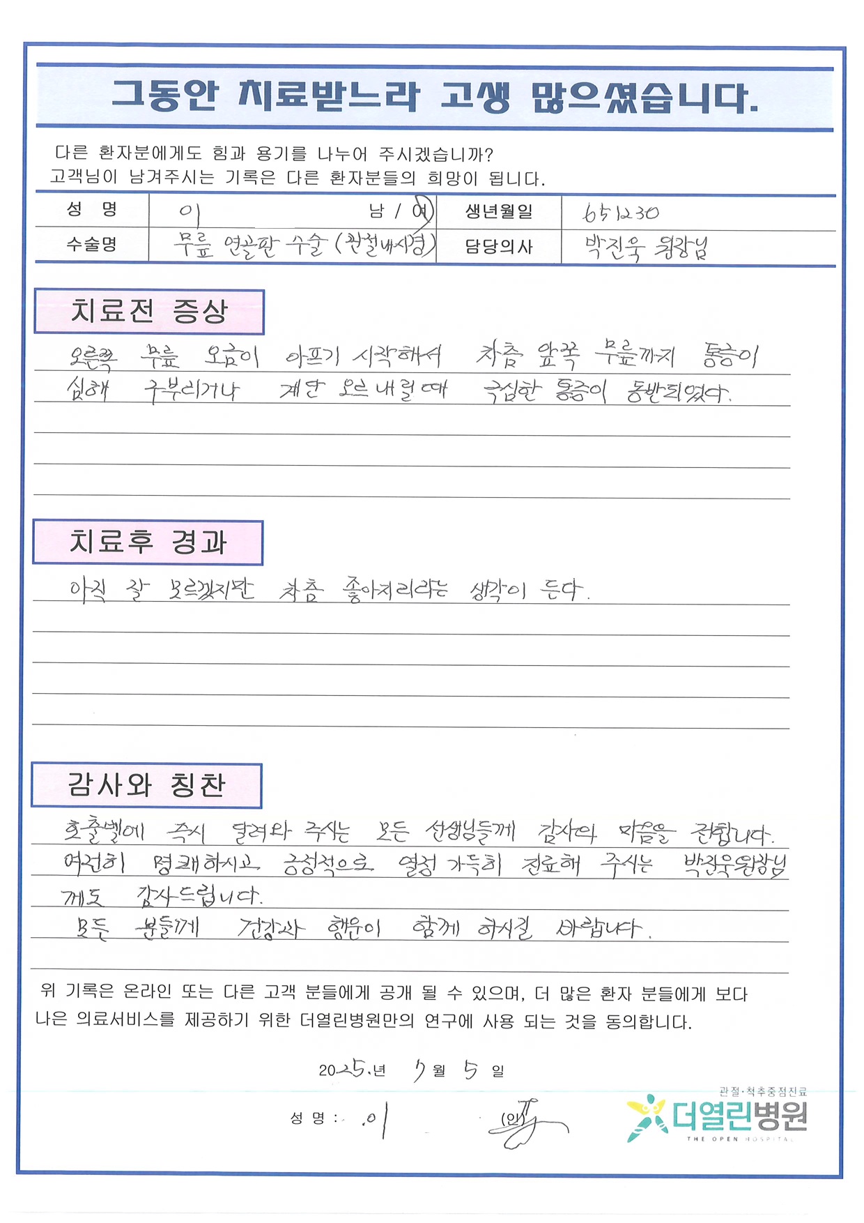 우측 반월상연골부분절제술 페이지 정보 작성자 관리자 댓글 0건 조회 30회 작성일 25-08-05 09:49 본문 목록 이전글우측 무릎 인공관절치환술 25.08.05 다음글좌측 슬관절 반월상연골부분절제술 및 체내고정용금속 제거술 25.07.02 댓글목록 댓글목록 등록된 댓글이 없습니다.
