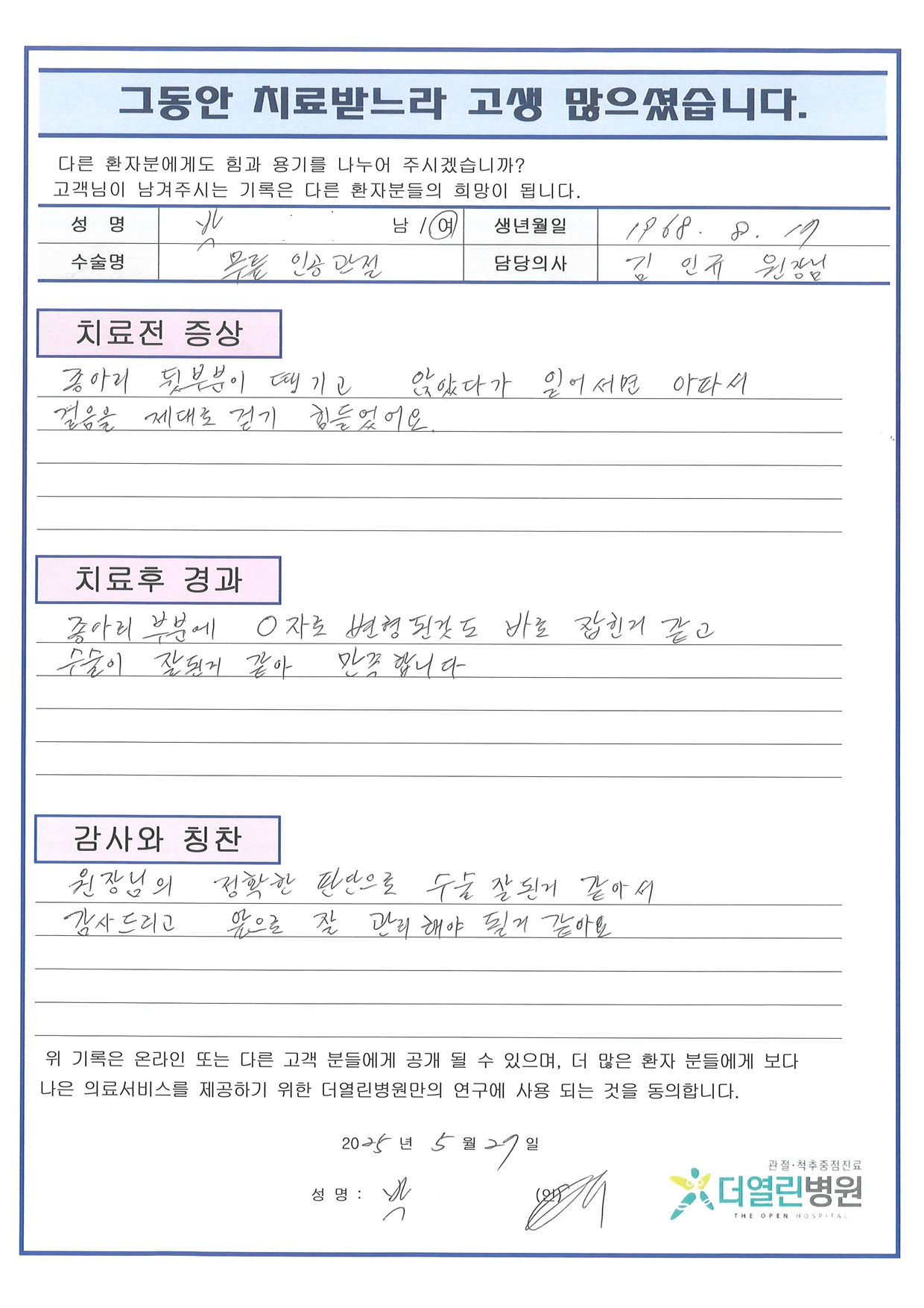 우측 무릎 인공관절치환술 페이지 정보 작성자 관리자 댓글 0건 조회 47회 작성일 25-06-07 09:14 본문 목록 이전글양측 무릎 인공관절치환술 25.06.07 다음글우측 반월상연골부분절제술 25.06.07 댓글목록 댓글목록 등록된 댓글이 없습니다.
