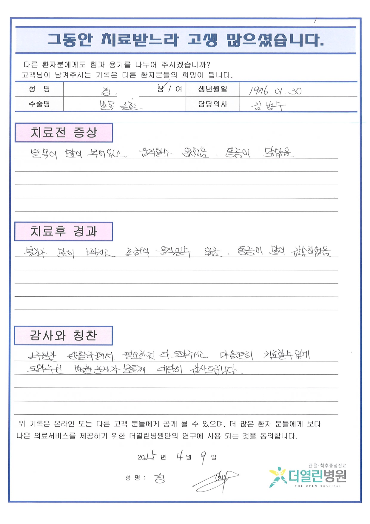 우측 발목 관혈적 정복술 및 금속판 고정술 페이지 정보 작성자 관리자 댓글 0건 조회 56회 작성일 25-05-03 10:10 본문 목록 이전글좌측 경골의 혈종제거술 25.05.03 다음글좌측 무릎 인공관절치환술 25.05.03 댓글목록 댓글목록 등록된 댓글이 없습니다.