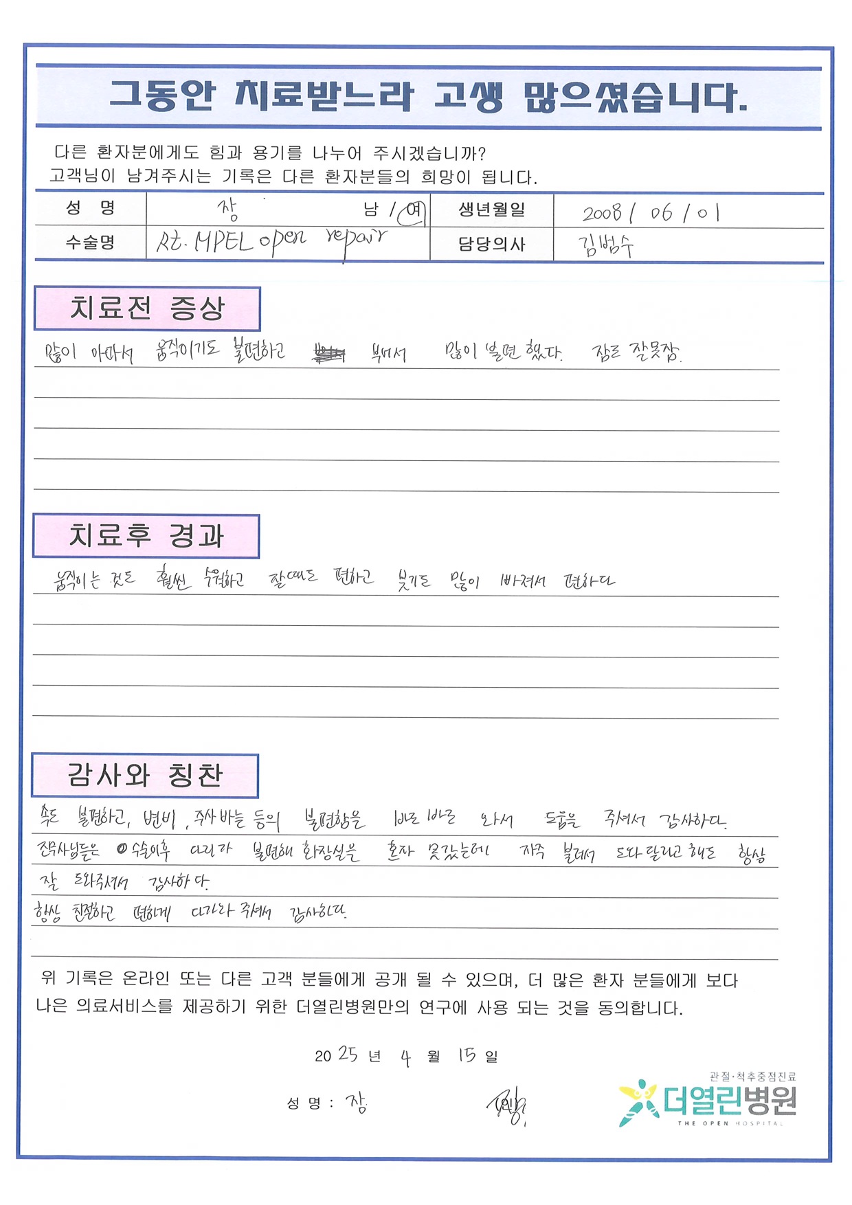 우측 무릎 관절낭, 내측슬개대퇴인대 봉합술 페이지 정보 작성자 관리자 댓글 0건 조회 85회 작성일 25-05-03 10:13 본문 목록 이전글우측 원위 요골 관혈적 정복술 및 금속판 고정술 25.05.03 다음글좌측 경골의 혈종제거술 25.05.03 댓글목록 댓글목록 등록된 댓글이 없습니다.