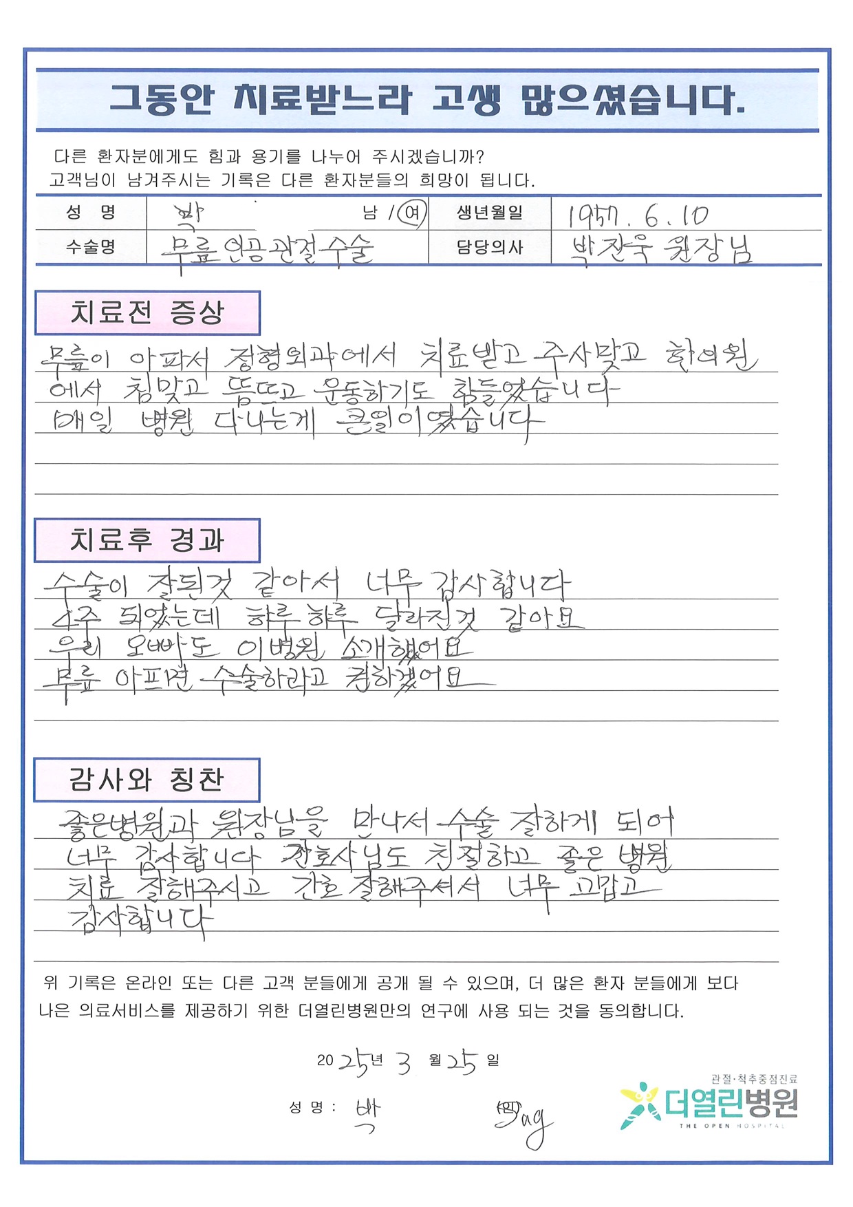 양측 무릎 인공관절치환술 페이지 정보 작성자 관리자 댓글 0건 조회 102회 작성일 25-04-02 16:42 본문 목록 이전글좌측 반월상연골절제술 25.04.02 다음글양측 무릎 인공관절치환술 25.04.02 댓글목록 댓글목록 등록된 댓글이 없습니다.