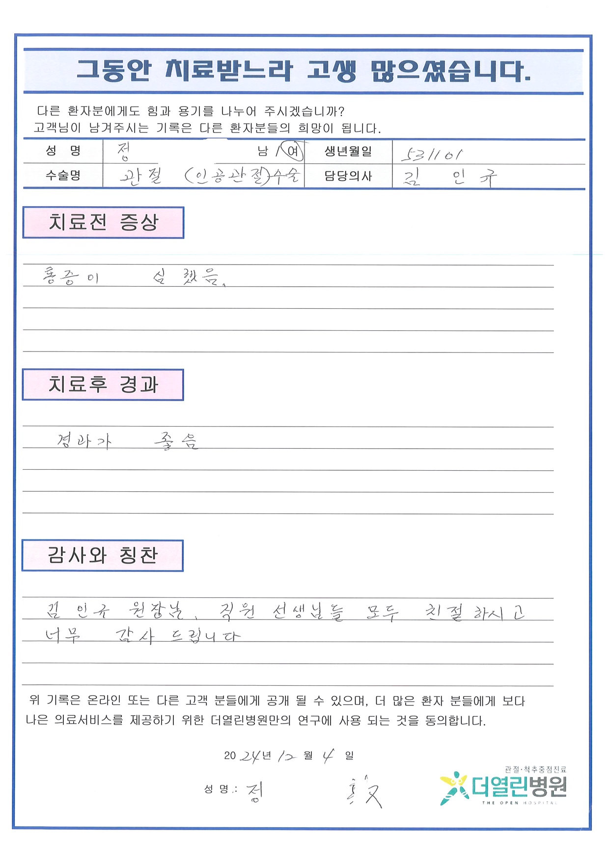 양측 무릎 인공관절치환술 페이지 정보 작성자 관리자 댓글 0건 조회 114회 작성일 25-01-07 11:31 본문 목록 이전글좌측 무릎 세척술 및 관절낭 봉합술 25.01.07 다음글우측 무릎 인공관절부분치환술 및 좌측 반월상연골 절제술 25.01.07 댓글목록 댓글목록 등록된 댓글이 없습니다.