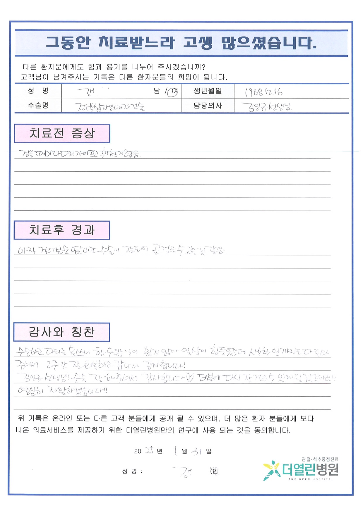 우측 전방십자인대 재건술 페이지 정보 작성자 관리자 댓글 0건 조회 99회 작성일 25-02-11 16:07 본문 목록 이전글우측 회전근개 봉합술 및 견봉 성형술, 이두장근 절제술 25.02.11 다음글우측 무릎 인공관절치환술 25.02.11 댓글목록 댓글목록 등록된 댓글이 없습니다.