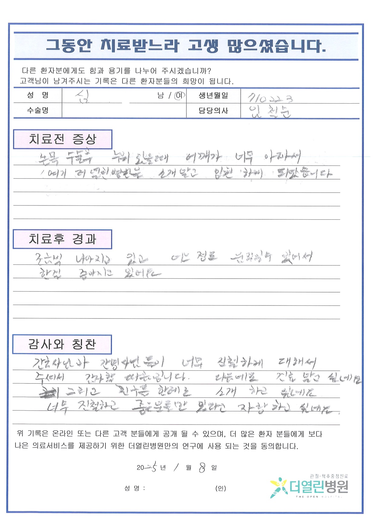 우측 회전근개 봉합술 및 견봉 성형술, 이두장근 절제술 페이지 정보 작성자 관리자 댓글 0건 조회 109회 작성일 25-02-11 16:10 본문 목록 이전글우측 손목 삼각섬유연골복합체 봉합술 25.02.11 다음글우측 전방십자인대 재건술 25.02.11 댓글목록 댓글목록 등록된 댓글이 없습니다.