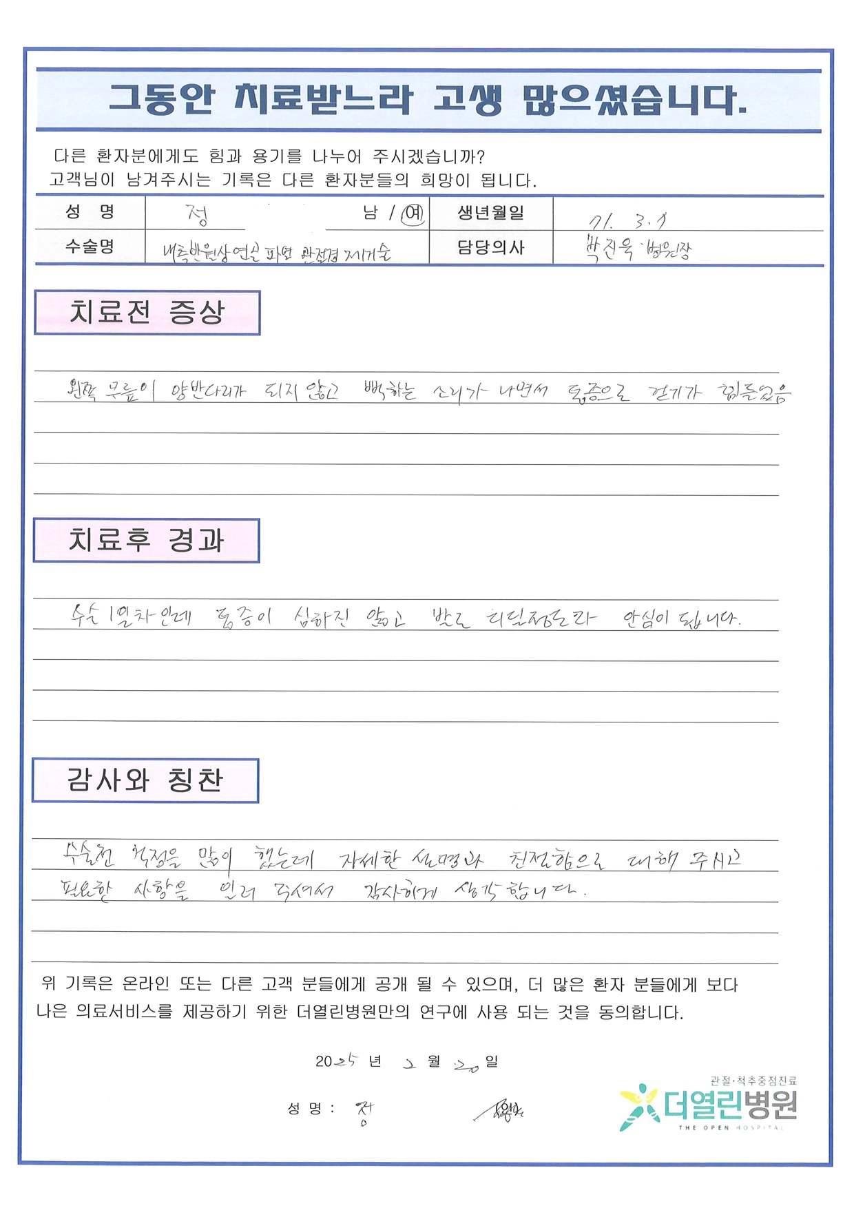 좌측 반월상연골부분절제술 페이지 정보 작성자 관리자 댓글 0건 조회 84회 작성일 25-03-06 16:39 본문 목록 이전글양측 무릎 인공관절치환술 25.03.06 다음글우측 반월상연골절제술 25.03.06 댓글목록 댓글목록 등록된 댓글이 없습니다.