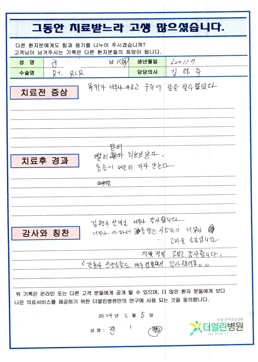 우측 어깨 관절경적 회전근개 봉합술 및 견봉하 감압술 페이지 정보 작성자 관리자 댓글 0건 조회 126회 작성일 24-12-05 15:52 본문 목록 이전글우측 무릎 인공관절치환술 24.12.05 다음글우측 대퇴골 관혈적 정복술 후 금속정 고정술 24.12.05 댓글목록 댓글목록 등록된 댓글이 없습니다.