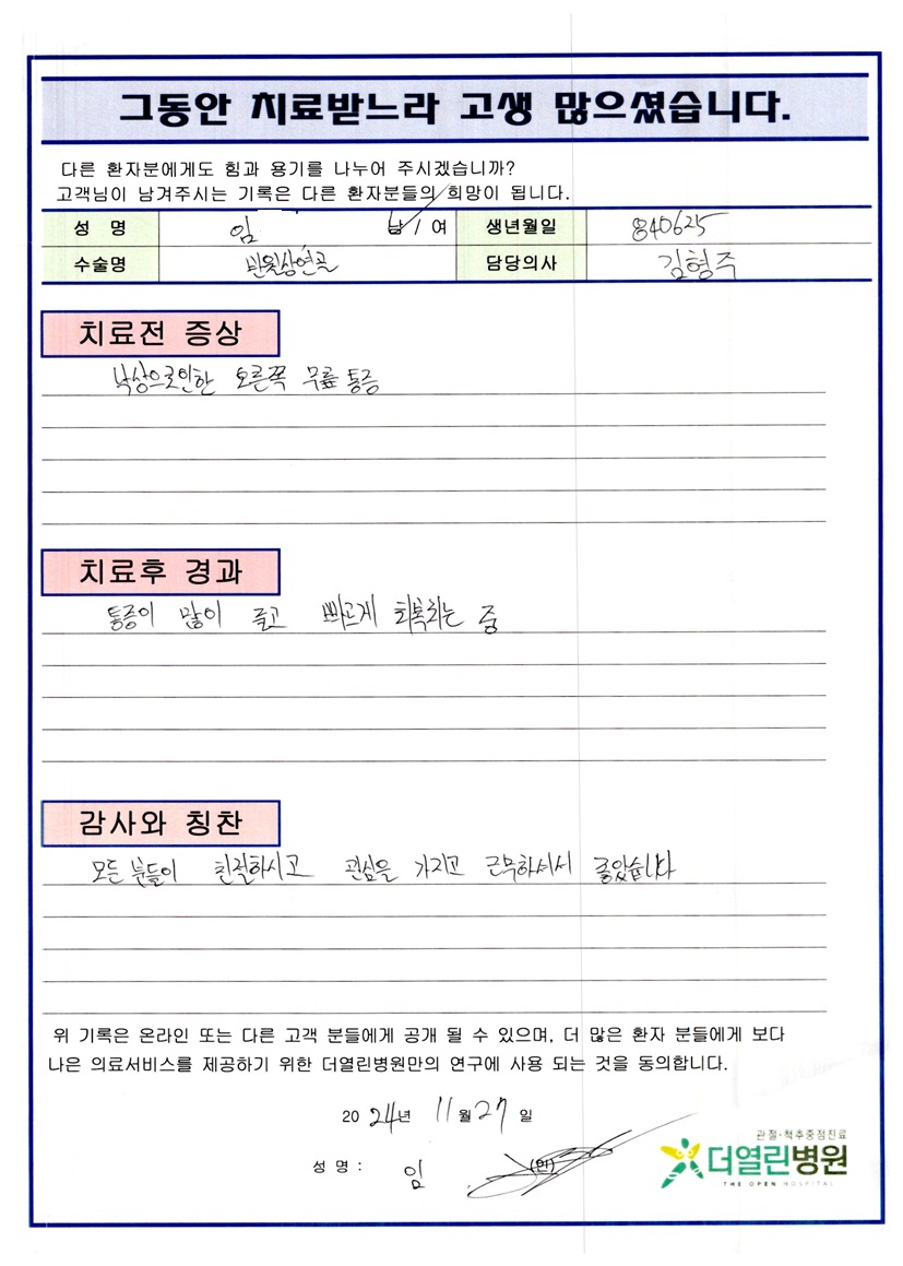 우측 반월상연골봉합술 및 장하지 부목고정 페이지 정보 작성자 관리자 댓글 0건 조회 116회 작성일 24-12-05 15:53 본문 목록 이전글우측 반월상연골부분절제술 및 경골제거술 24.12.05 다음글우측 무릎 인공관절치환술 24.12.05 댓글목록 댓글목록 등록된 댓글이 없습니다.