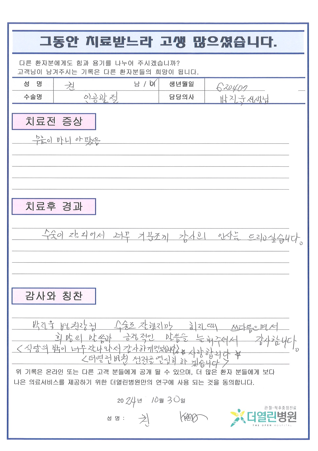 양측 무릎 인공관절치환술 페이지 정보 작성자 관리자 댓글 0건 조회 105회 작성일 24-11-05 16:02 본문 목록 이전글우측 무릎 인공관절치환술 24.11.05 다음글좌측 무릎 인공관절치환술 24.11.05 댓글목록 댓글목록 등록된 댓글이 없습니다.