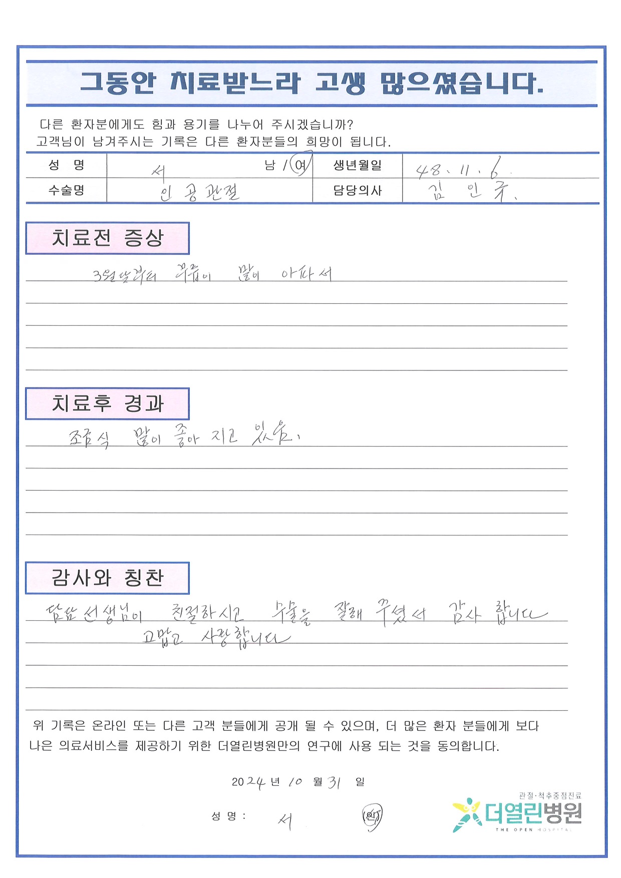 좌측 무릎 인공관절치환술 페이지 정보 작성자 관리자 댓글 0건 조회 119회 작성일 24-11-05 16:03 본문 목록 이전글좌측 견관절 회전근개 봉합술 및 견봉하 성형술, 이두장근 절제술 24.11.05 다음글좌측 반월상연골절제술 24.11.05 댓글목록 댓글목록 등록된 댓글이 없습니다.