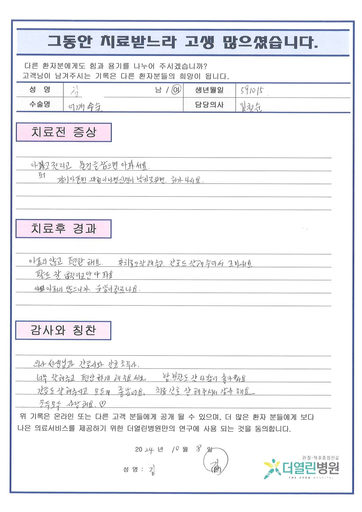 좌측 견관절 회전근개 봉합술 및 견봉하 성형술, 이두장근 절제술 페이지 정보 작성자 관리자 댓글 0건 조회 127회 작성일 24-11-05 16:04 본문 목록 이전글양측 무릎 인공관절치환술 24.11.05 다음글좌측 무릎 인공관절치환술 24.11.05 댓글목록 댓글목록 등록된 댓글이 없습니다.