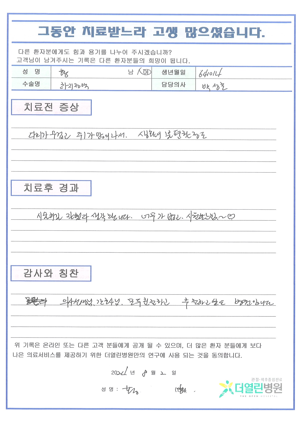 베나실 및 혈관 경화술 페이지 정보 작성자 관리자 댓글 0건 조회 110회 작성일 24-09-03 15:29 본문 목록 이전글좌측 반월상연골부분절제술 24.10.01 다음글우측 반월상연골부분절제술 및 미세골절술,근위경골절골술 24.09.03 댓글목록 댓글목록 등록된 댓글이 없습니다.