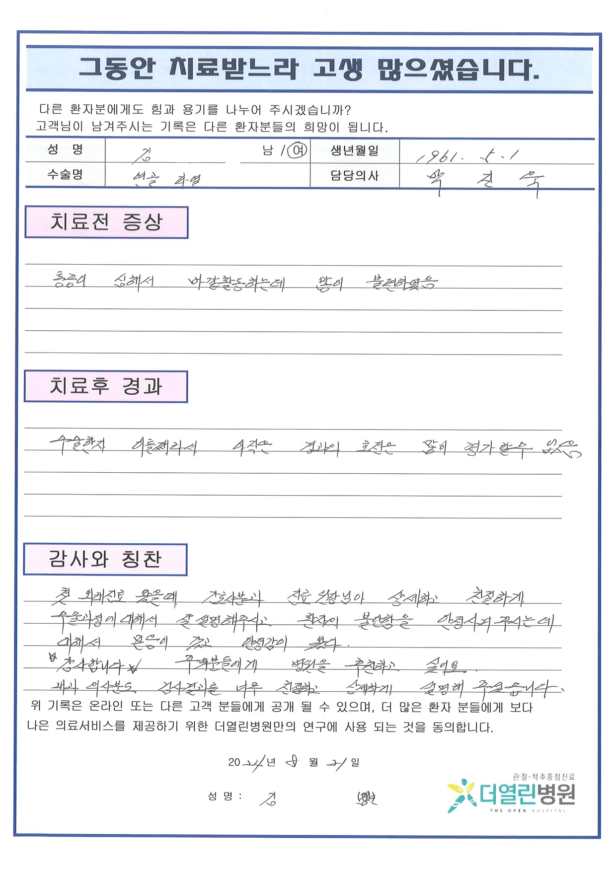 좌측 반월상연골부분절제술 페이지 정보 작성자 관리자 댓글 0건 조회 103회 작성일 24-09-03 15:20 본문 목록 이전글좌측 슬관절 관절내 낭종 제거술 24.09.03 다음글우측 무릎 인공관절치환술 24.09.03 댓글목록 댓글목록 등록된 댓글이 없습니다.