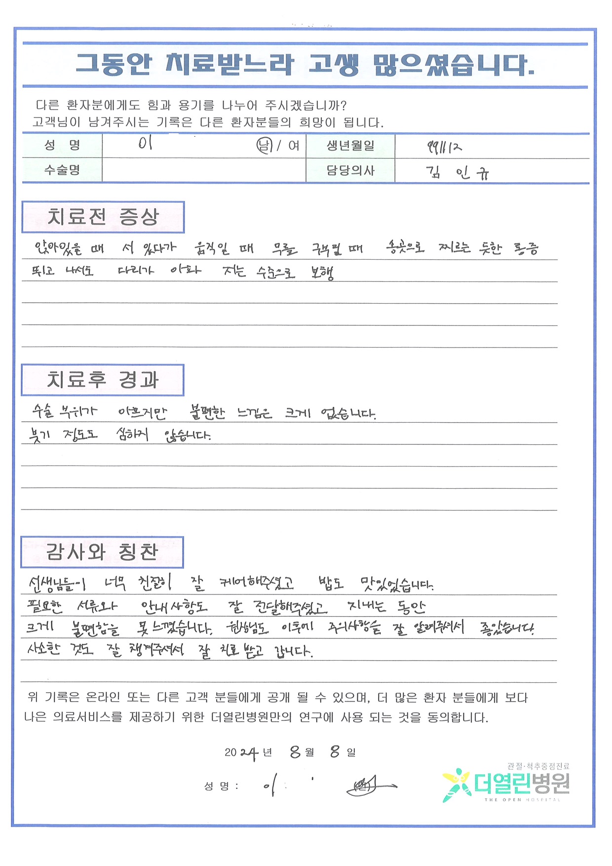 좌측 슬관절 관절내 낭종 제거술 페이지 정보 작성자 관리자 댓글 0건 조회 115회 작성일 24-09-03 15:20 본문 목록 이전글좌측 반월상연골절제술 24.09.03 다음글좌측 반월상연골부분절제술 24.09.03 댓글목록 댓글목록 등록된 댓글이 없습니다.