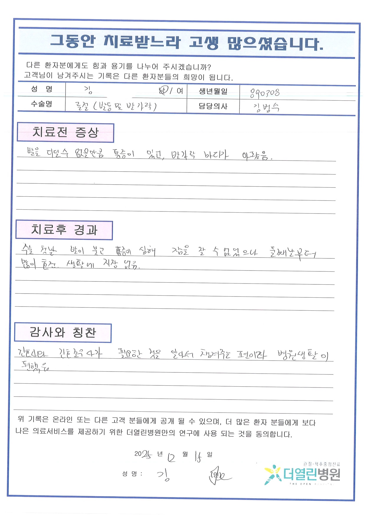 우측 족부의 리스프랑관절 관혈적 정복술 및 금속판 고정술 페이지 정보 작성자 관리자 댓글 0건 조회 37회 작성일 26-01-06 09:44 본문 목록 이전글좌측 무릎 인공관절치환술 및 우측 경골금속내고정물 제거술 26.02.05 다음글좌측 반월상연골판부분절제술 26.01.06 댓글목록 댓글목록 등록된 댓글이 없습니다.