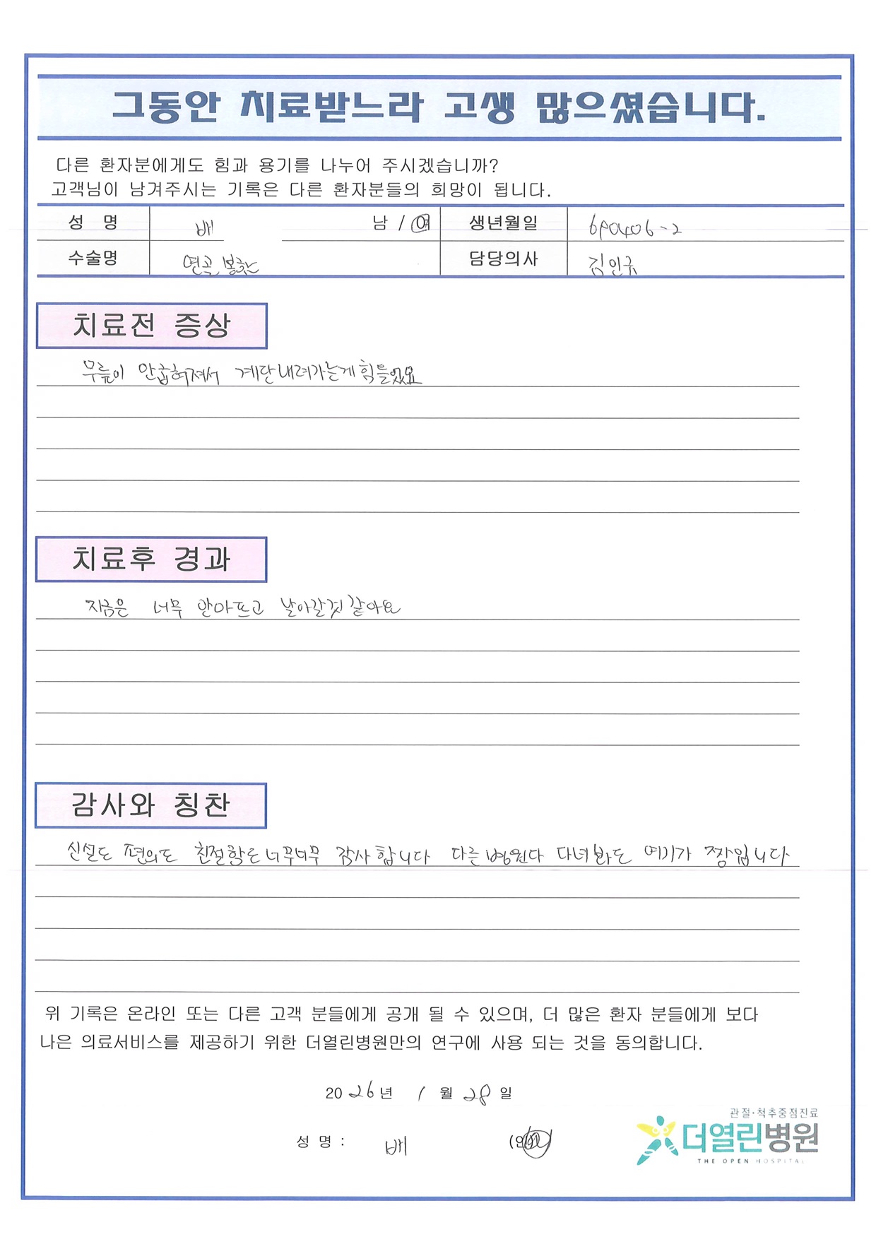좌측 반월상연골절제술 페이지 정보 작성자 관리자 댓글 0건 조회 21회 작성일 26-02-05 14:35 본문 목록 이전글우측 반월상연골부분절제술 26.02.05 다음글좌측 반월상연골절제술 26.02.05 댓글목록 댓글목록 등록된 댓글이 없습니다.
