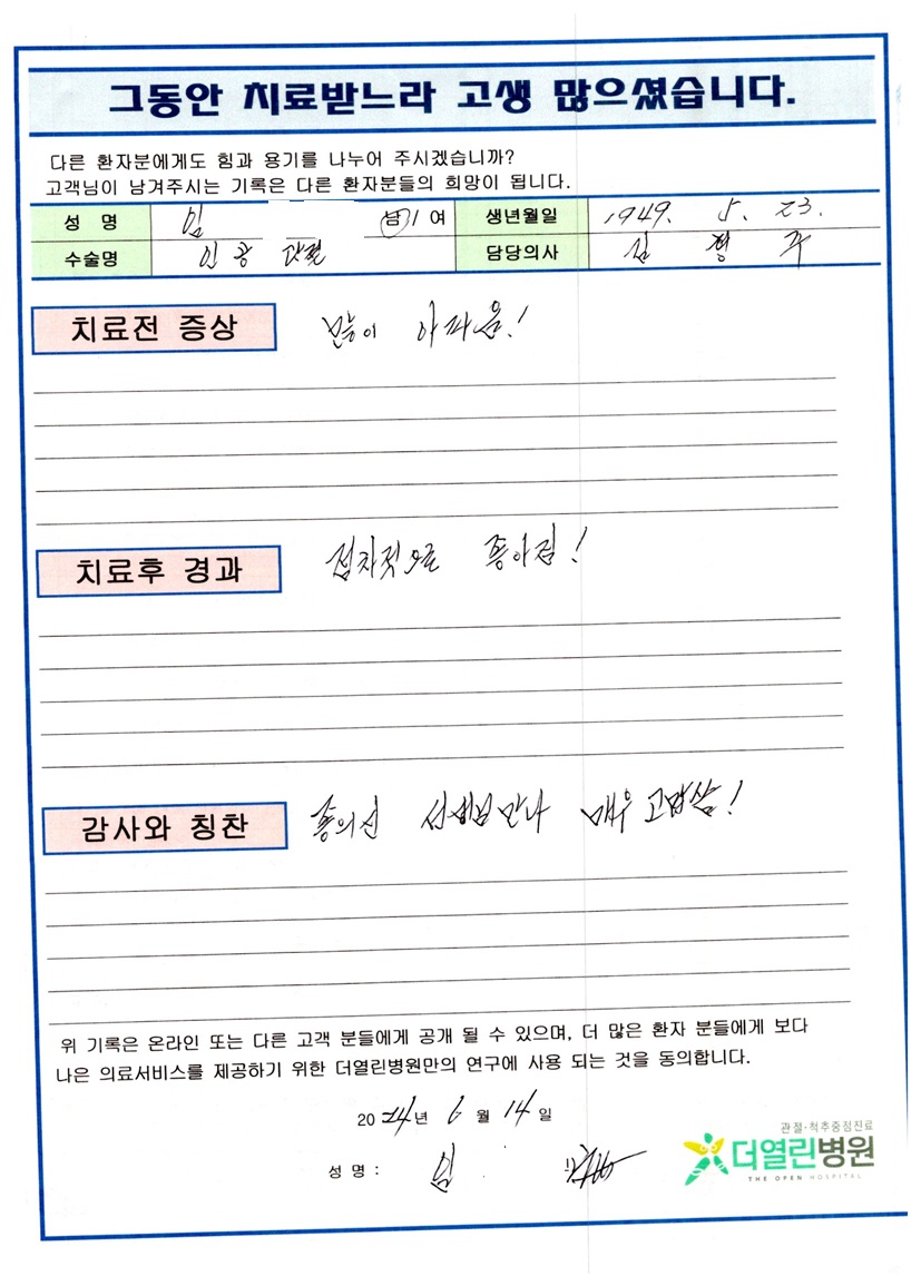 양측 무릎 인공관절치환술 페이지 정보 작성자 관리자 댓글 0건 조회 122회 작성일 24-07-04 15:58 본문 목록 이전글우측 고관절 반치환술 24.07.04 다음글우측 견관절 인공관절 치환술 24.07.04 댓글목록 댓글목록 등록된 댓글이 없습니다.
