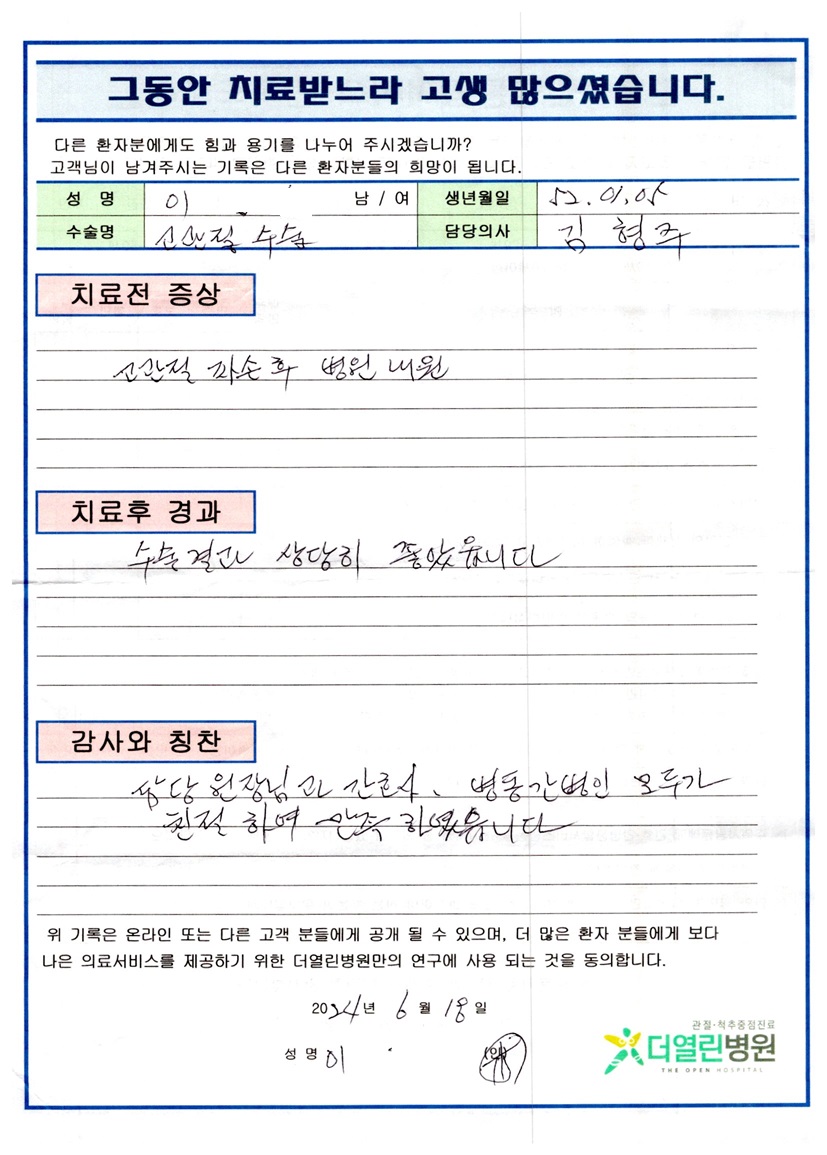 우측 고관절 반치환술 페이지 정보 작성자 관리자 댓글 0건 조회 176회 작성일 24-07-04 15:59 본문 목록 이전글우측 전방십자인대 재건술, 반월상연골절제술 24.07.04 다음글양측 무릎 인공관절치환술 24.07.04 댓글목록 댓글목록 등록된 댓글이 없습니다.