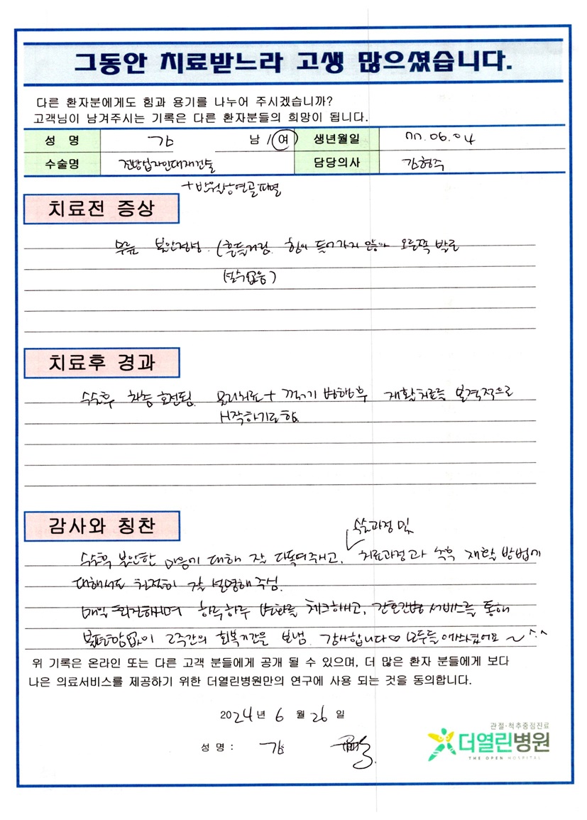 우측 전방십자인대 재건술, 반월상연골절제술 페이지 정보 작성자 관리자 댓글 0건 조회 124회 작성일 24-07-04 15:59 본문 목록 이전글좌측 무릎 인공관절치환술 24.08.13 다음글우측 고관절 반치환술 24.07.04 댓글목록 댓글목록 등록된 댓글이 없습니다.