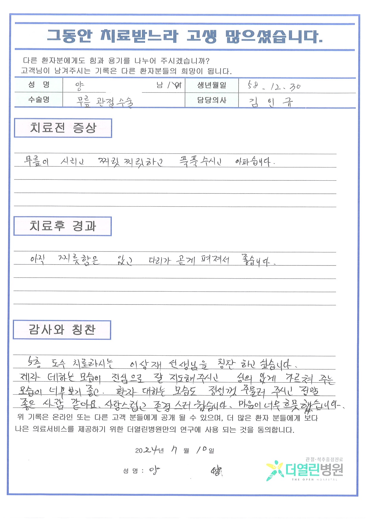 양측 무릎 인공관절치환술 페이지 정보 작성자 관리자 댓글 0건 조회 114회 작성일 24-08-13 09:27 본문 목록 이전글좌측 반월상연골봉합술 24.08.13 다음글우측 반월상연골절제술 24.08.13 댓글목록 댓글목록 등록된 댓글이 없습니다.