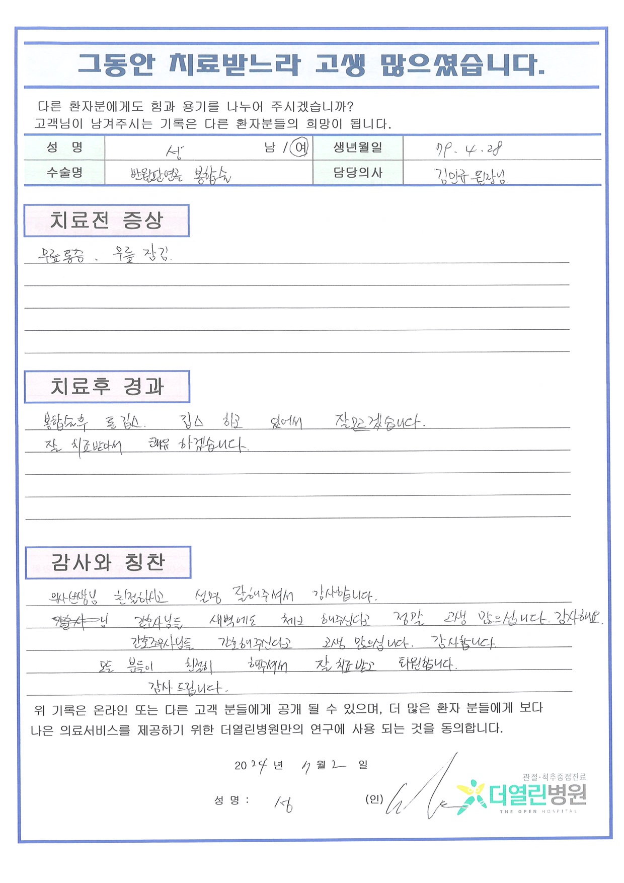 좌측 반월상연골봉합술 페이지 정보 작성자 관리자 댓글 0건 조회 179회 작성일 24-08-13 09:27 본문 목록 이전글좌측 반월상연골절제술 24.08.13 다음글양측 무릎 인공관절치환술 24.08.13 댓글목록 댓글목록 등록된 댓글이 없습니다.