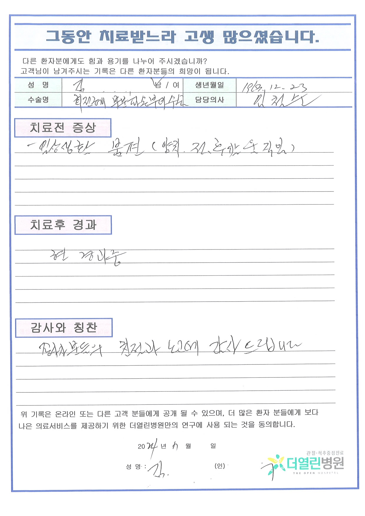 우측 견관절 회전근개 봉합술 및 견봉하 성형술, 이두장근 절제술 페이지 정보 작성자 관리자 댓글 0건 조회 149회 작성일 24-08-13 09:37 본문 목록 이전글좌측 반월상연골부분절제술 24.08.13 다음글우측 고관절 전치환술 24.08.13 댓글목록 댓글목록 등록된 댓글이 없습니다.