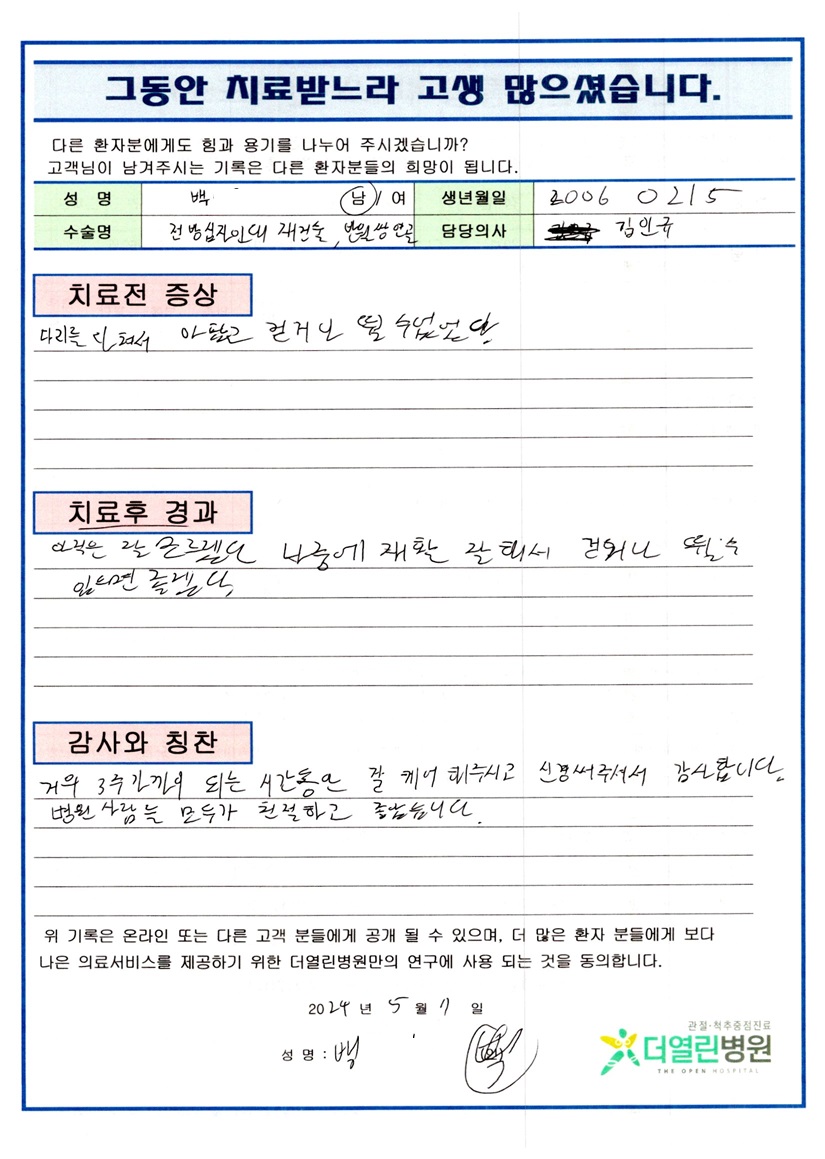 좌측 전방십자인대 재건술, 반월상연골봉합술 페이지 정보 작성자 관리자 댓글 0건 조회 106회 작성일 24-06-04 12:25 본문 목록 이전글좌측 견관절 회전근개 봉합술 및 견봉하 감압술 24.06.04 다음글좌측 반월상연골절제술 24.06.04 댓글목록 댓글목록 등록된 댓글이 없습니다.