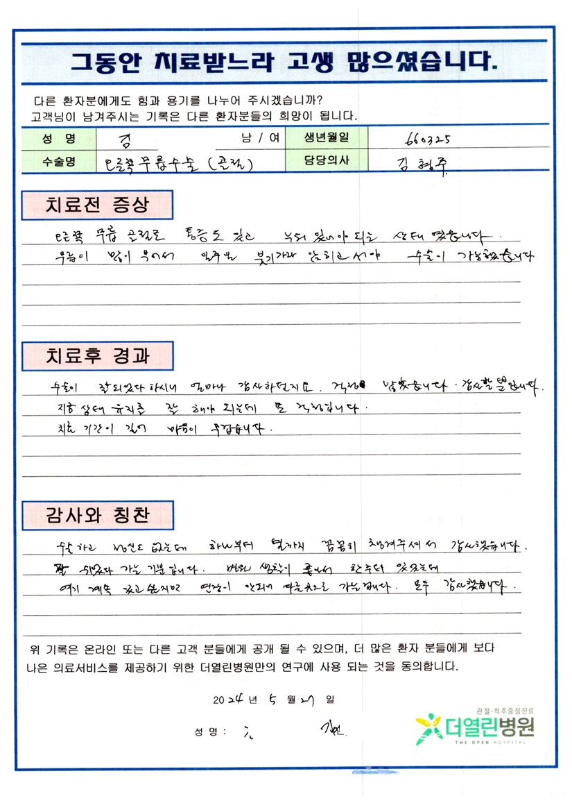우측 근위 경골 관혈적 정복술 후 금속판 고정술 페이지 정보 작성자 관리자 댓글 0건 조회 121회 작성일 24-06-04 12:26 본문 목록 이전글좌측 발목골절 관혈적 정복술 및 내고정술 24.06.04 다음글좌측 견관절 회전근개 봉합술 및 견봉하 감압술 24.06.04 댓글목록 댓글목록 등록된 댓글이 없습니다.