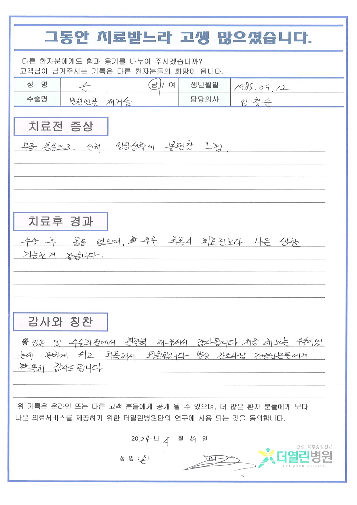 우측 반월상연골부분절제술 페이지 정보 작성자 관리자 댓글 0건 조회 120회 작성일 24-05-04 12:02 본문 목록 이전글양측 무릎 인공관절치환술 24.06.04 다음글좌측 족관절 관혈적 정복술 및 금속 내고정술 24.05.04 댓글목록 댓글목록 등록된 댓글이 없습니다.