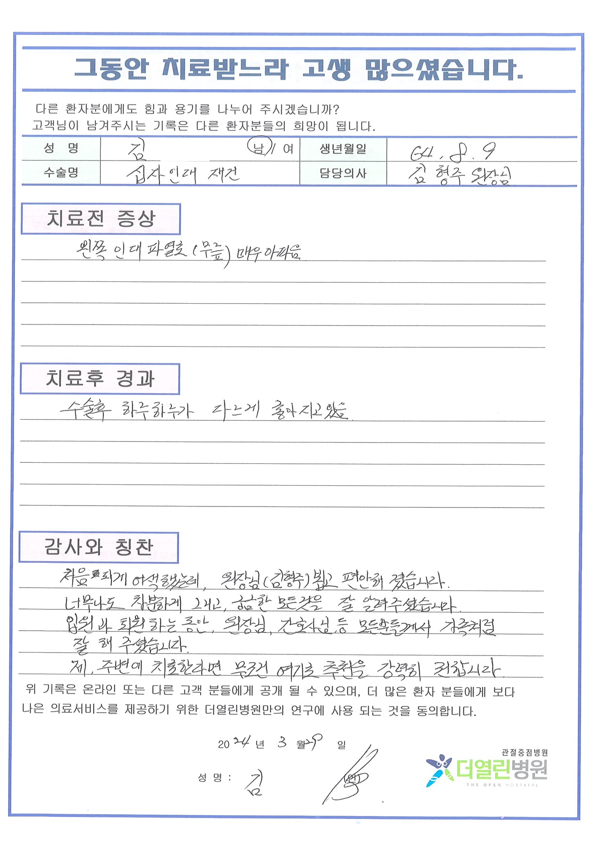 좌측 전방십자인대 재건술 페이지 정보 작성자 관리자 댓글 0건 조회 109회 작성일 24-04-04 17:11 본문 목록 이전글좌측 반월상연골절제술 24.04.04 다음글좌측 반월상연골절제술 24.04.04 댓글목록 댓글목록 등록된 댓글이 없습니다.