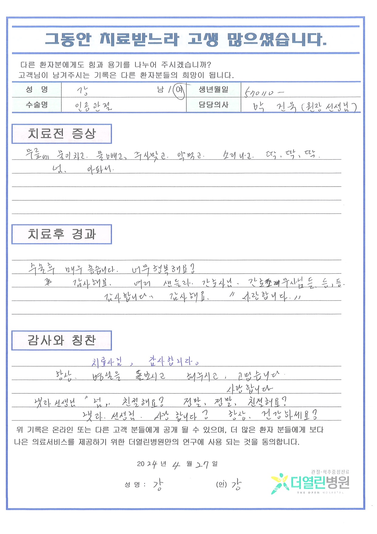 양측 무릎 인공관절치환술 페이지 정보 작성자 관리자 댓글 0건 조회 130회 작성일 24-05-04 11:47 본문 목록 이전글우측 무릎 인공관절치환술 24.05.04 다음글우측 무릎 인공관절재치환술 24.05.04 댓글목록 댓글목록 등록된 댓글이 없습니다.