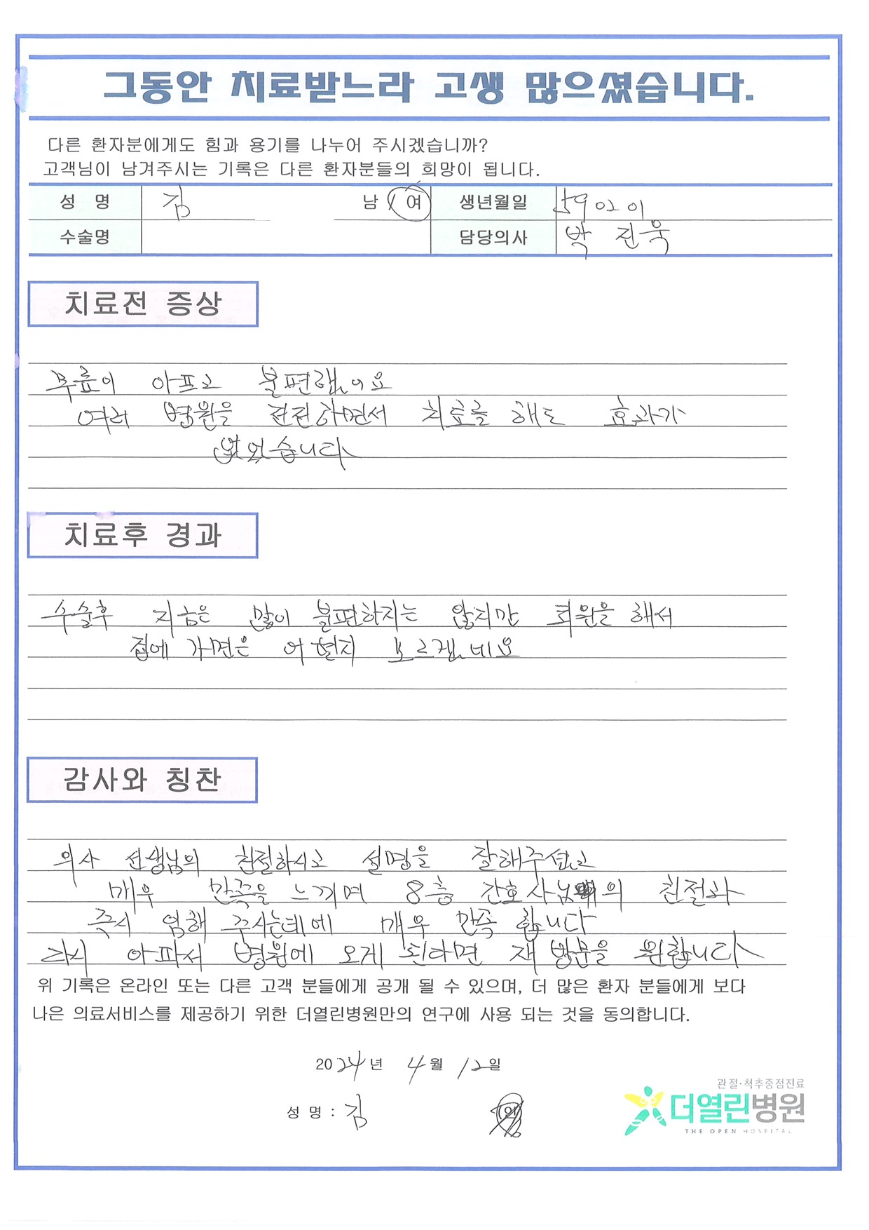 우측 무릎 인공관절치환술 페이지 정보 작성자 관리자 댓글 0건 조회 108회 작성일 24-05-04 11:49 본문 목록 이전글양측 반월판연골절제술 24.05.04 다음글양측 무릎 인공관절치환술 24.05.04 댓글목록 댓글목록 등록된 댓글이 없습니다.