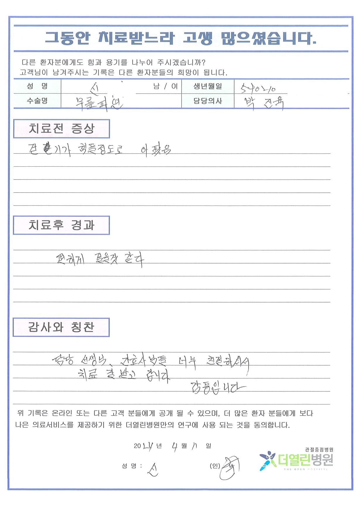 양측 반월판연골절제술 페이지 정보 작성자 관리자 댓글 0건 조회 126회 작성일 24-05-04 11:50 본문 목록 이전글양측 무릎 인공관절치환술 24.05.04 다음글우측 무릎 인공관절치환술 24.05.04 댓글목록 댓글목록 등록된 댓글이 없습니다.