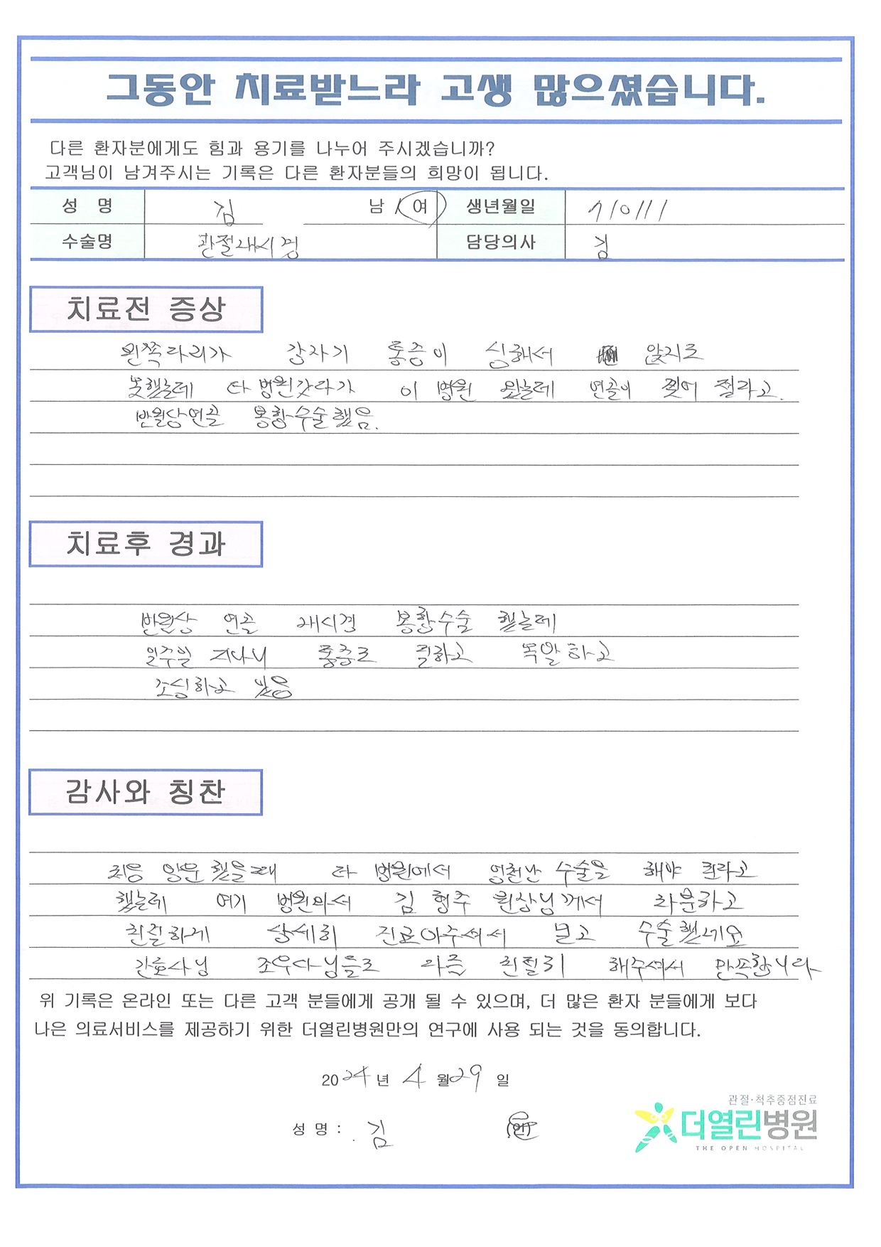 좌측 반월상연골봉합술 페이지 정보 작성자 관리자 댓글 0건 조회 116회 작성일 24-05-04 11:53 본문 목록 이전글우측 족관절 전거비인대 보강술 24.05.04 다음글우측 무릎 인공관절부분치환술 24.05.04 댓글목록 댓글목록 등록된 댓글이 없습니다.