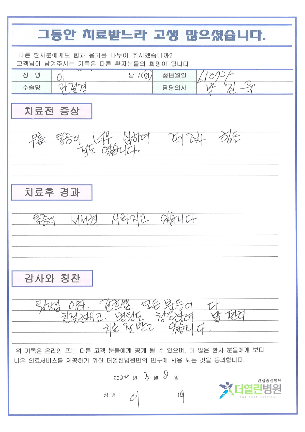 좌측 반월상연골절제술 페이지 정보 작성자 관리자 댓글 0건 조회 95회 작성일 24-04-04 17:10 본문 목록 이전글좌측 반월상연골절제술 24.04.04 다음글우측 반월상연골절제술 24.04.04 댓글목록 댓글목록 등록된 댓글이 없습니다.