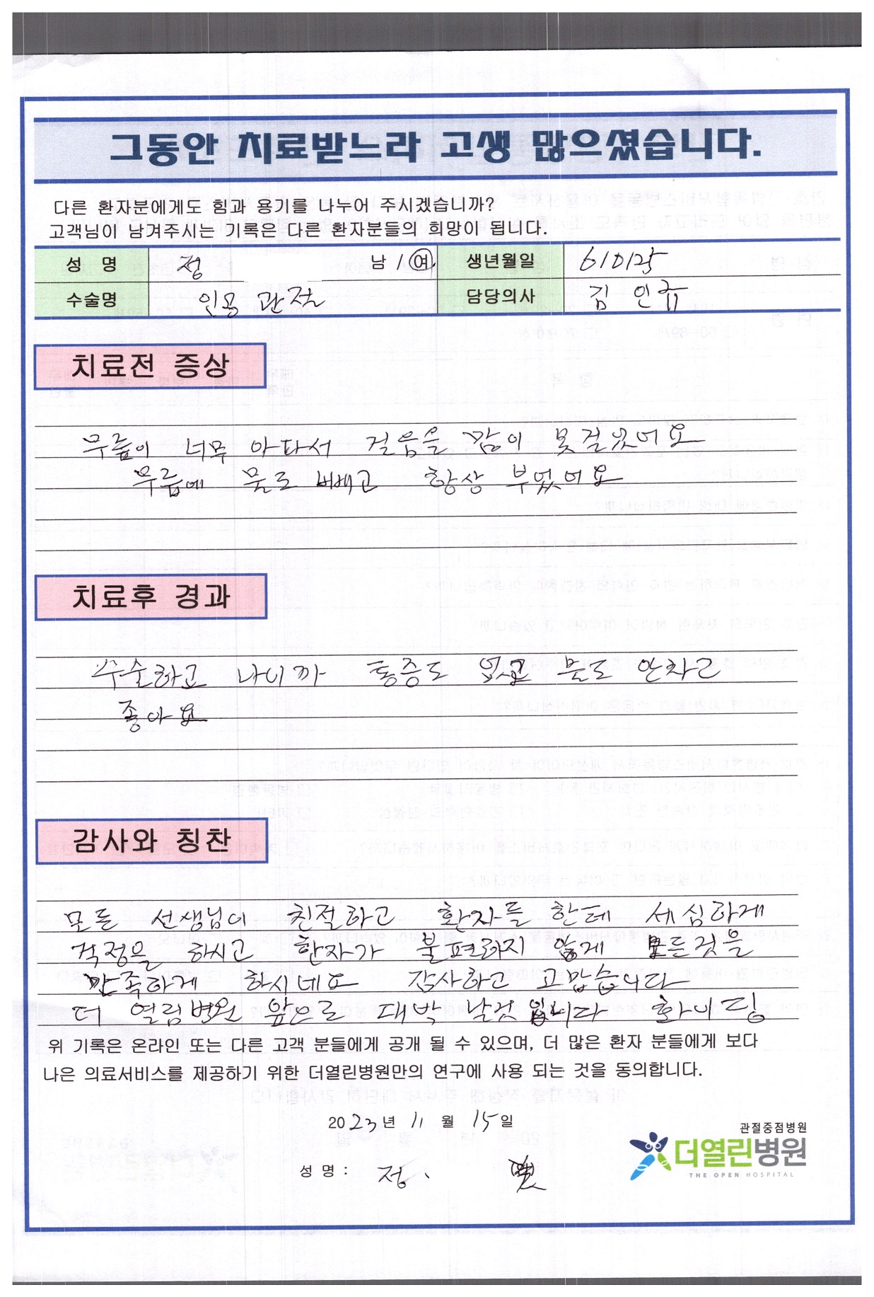 좌측 무릎 인공관절치환술 페이지 정보 작성자 관리자 댓글 0건 조회 93회 작성일 23-12-02 11:56 본문 목록 이전글우측 무릎 인공관절치환술 23.12.02 다음글견봉성형술 및 회전근개 봉합술, 석회화 건염 감압술 23.11.02 댓글목록 댓글목록 등록된 댓글이 없습니다.
