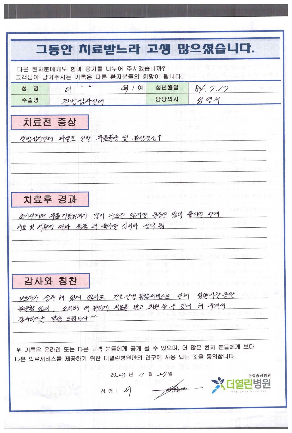 우측 전방십자인대 재건술, 반월상연골봉합술 페이지 정보 작성자 관리자 댓글 0건 조회 148회 작성일 23-12-02 12:00 본문 목록 이전글좌측 무릎 인공관절치환술 24.01.04 다음글우측 전방십자인대 재건술 23.12.02 댓글목록 댓글목록 등록된 댓글이 없습니다.