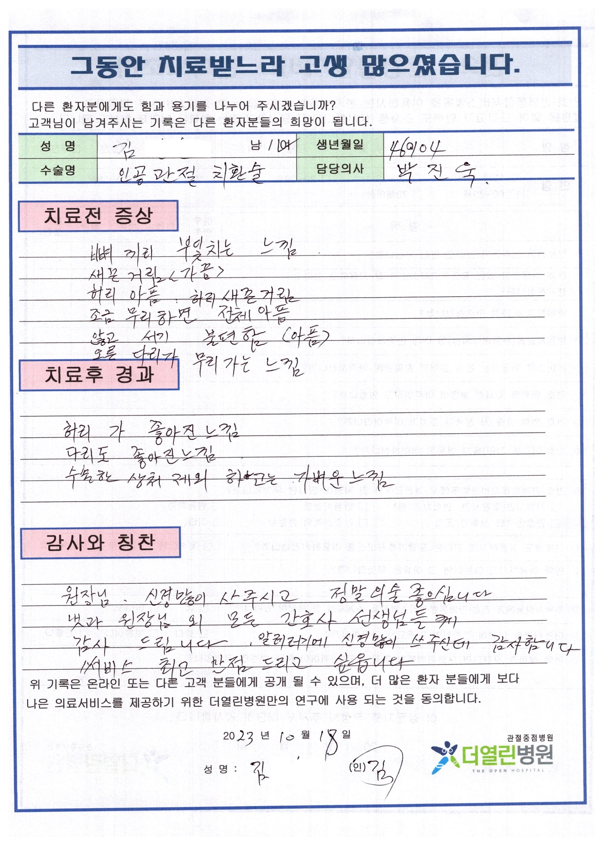 좌측 무릎 인공관절치환술 페이지 정보 작성자 관리자 댓글 0건 조회 114회 작성일 23-11-02 16:03 본문 목록 이전글양측 무릎 인공관절치환술 23.11.02 다음글좌측 반월상연골절제술 23.11.02 댓글목록 댓글목록 등록된 댓글이 없습니다.