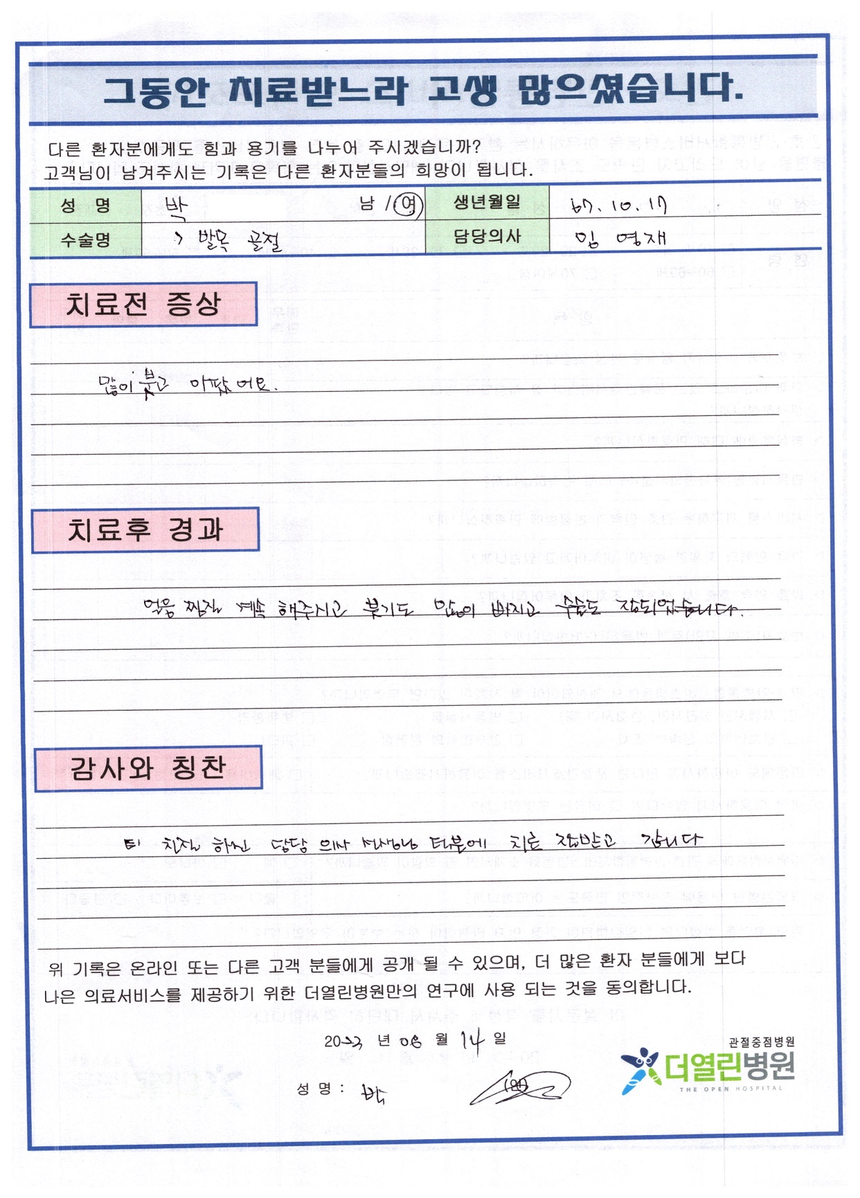 좌측 족관절 관혈적 정복술 및 금속 내고정술 페이지 정보 작성자 관리자 댓글 0건 조회 105회 작성일 23-09-07 16:44 본문 목록 이전글우측 전방십자인대 재건술, 반월상연골봉합술 23.09.07 다음글좌측 무릎 인공관절치환술 23.09.07 댓글목록 댓글목록 등록된 댓글이 없습니다.