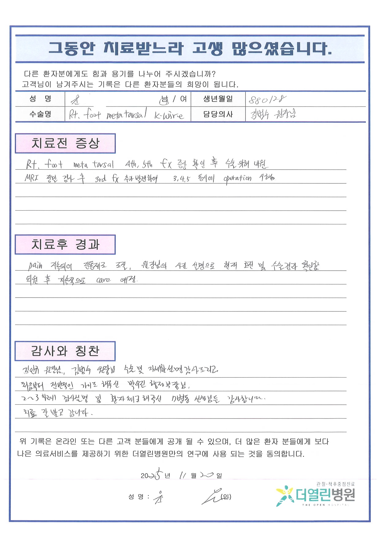 우측 제3,4,5 중족골 비관혈적 정복술 및 금속핀 고정술 페이지 정보 작성자 관리자 댓글 0건 조회 92회 작성일 25-12-03 14:22 본문 목록 이전글좌측 제5수지 중수골 관혈적 정복술 및 금속판 고정술 25.12.03 다음글우측 무릎 반월상연골판 부분절제술 25.12.03 댓글목록 댓글목록 등록된 댓글이 없습니다.
