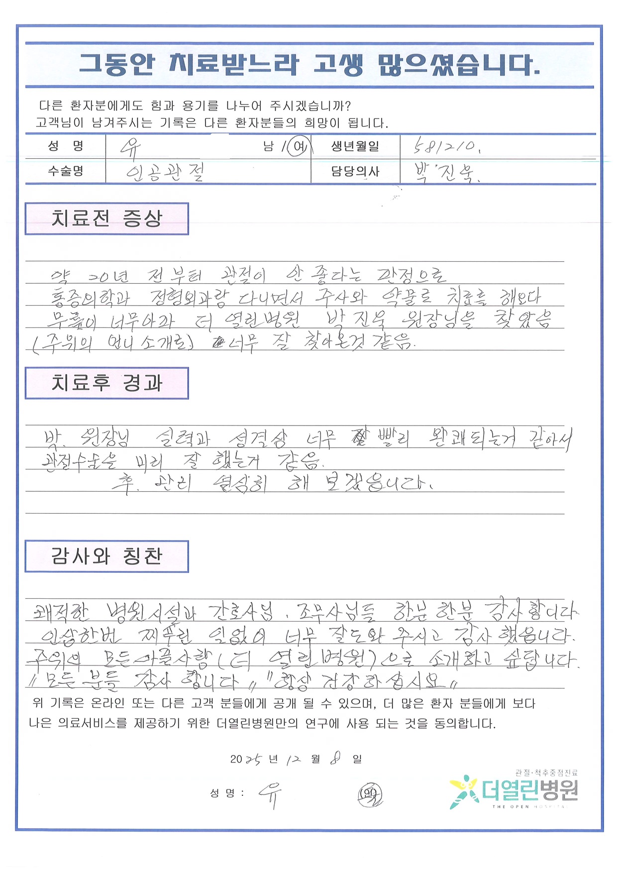 양측 무릎 인공관절치환술 페이지 정보 작성자 관리자 댓글 0건 조회 30회 작성일 26-01-06 09:38 본문 목록 이전글우측 무릎 인공관절치환술 26.01.06 다음글금속제거술 및 창상세척술 26.01.06 댓글목록 댓글목록 등록된 댓글이 없습니다.