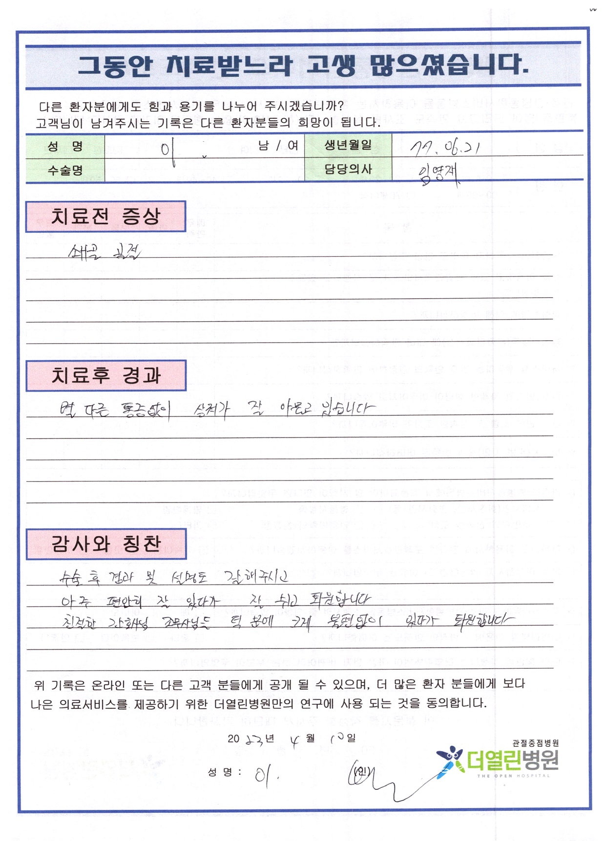 쇄골 관혈적 정복술 페이지 정보 작성자 관리자 댓글 0건 조회 89회 작성일 23-05-03 14:05 본문 목록 이전글좌측 반월상연골절제술 23.05.03 다음글전방십자인대 재건술 23.05.03 댓글목록 댓글목록 등록된 댓글이 없습니다.