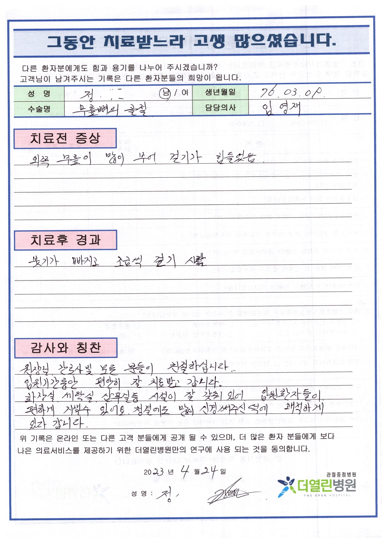 좌측 무릎뼈 관혈적 정복술 페이지 정보 작성자 관리자 댓글 0건 조회 89회 작성일 23-05-03 14:07 본문 목록 이전글양측 무릎 인공관절치환술 23.06.01 다음글좌측 반월상연골절제술 23.05.03 댓글목록 댓글목록 등록된 댓글이 없습니다.