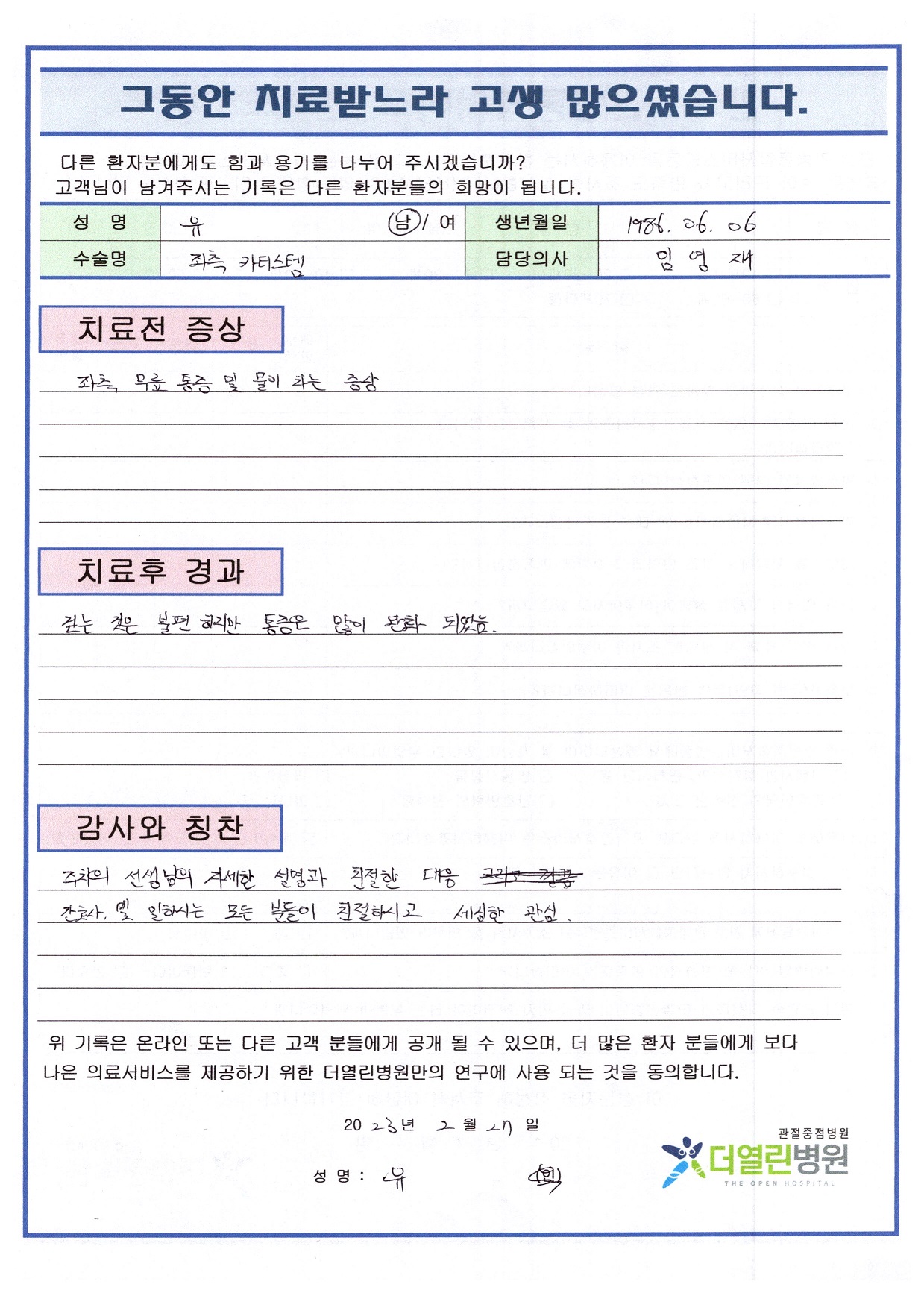 좌측 반월상연골절제술 및 줄기세포 페이지 정보 작성자 관리자 댓글 0건 조회 91회 작성일 23-03-04 12:02 본문 목록 이전글양측 슬관절 인공 관절 치환술 23.03.31 다음글좌측 반월상연골절제술 23.03.04 댓글목록 댓글목록 등록된 댓글이 없습니다.
