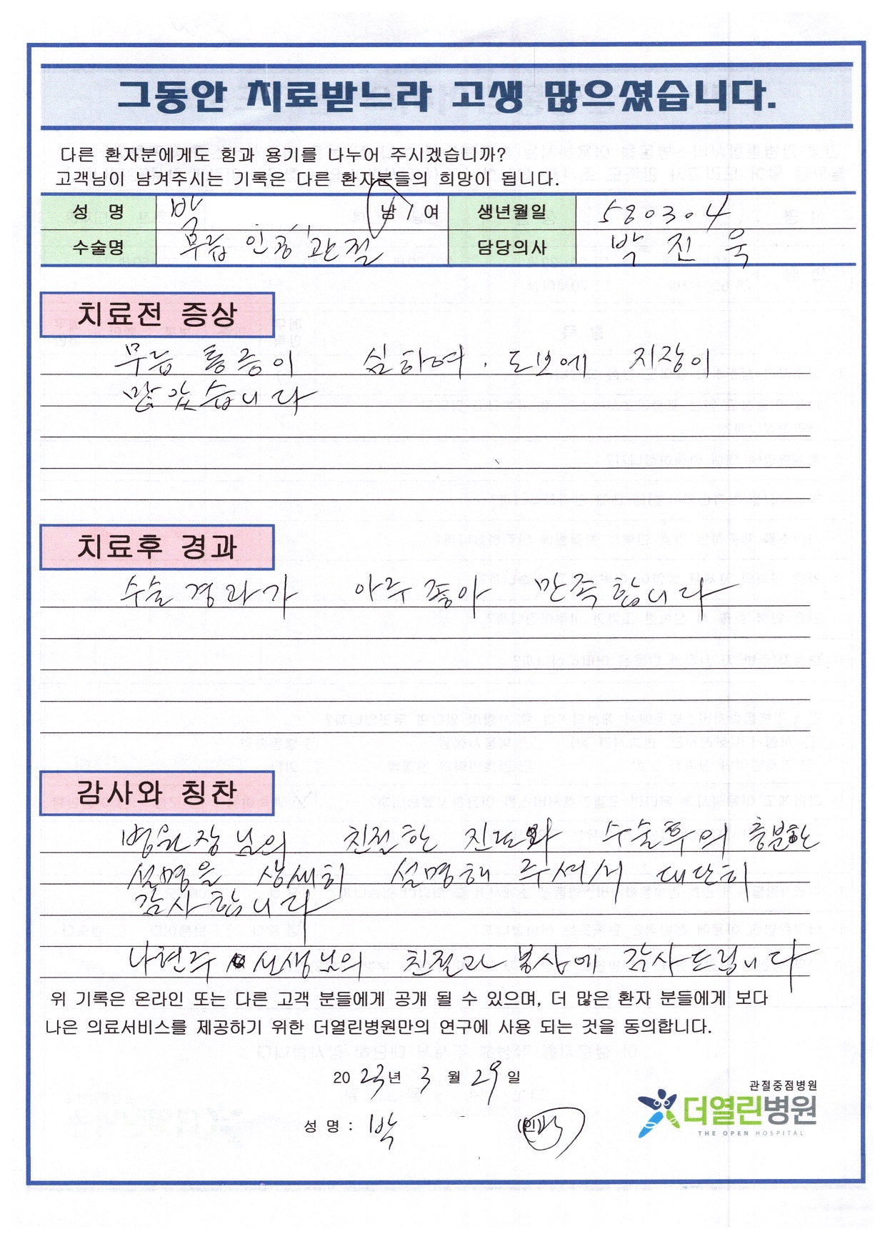 우측 슬관절 인공 관절 치환술 페이지 정보 작성자 관리자 댓글 0건 조회 74회 작성일 23-04-04 11:30 본문 목록 이전글우측 무릎 인공관절부분치환술 23.04.04 다음글우측 슬관절 인공 관절 치환술 23.04.04 댓글목록 댓글목록 등록된 댓글이 없습니다.