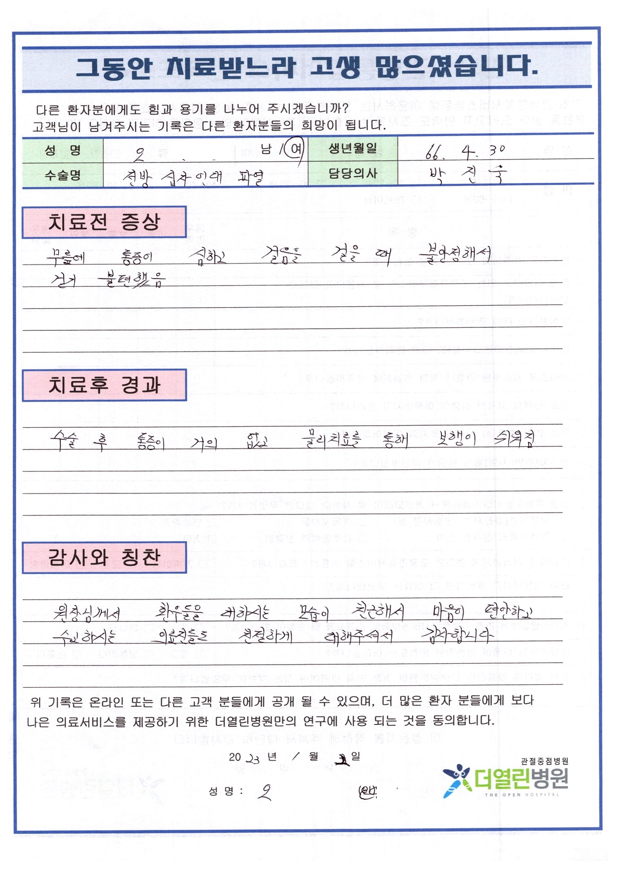 전방십자인대 재건술 페이지 정보 작성자 관리자 댓글 0건 조회 82회 작성일 23-02-04 10:37 본문 목록 이전글우측 반월상연골절제술 23.02.04 다음글좌측 반월상연골절제술 23.01.03 댓글목록 댓글목록 등록된 댓글이 없습니다.