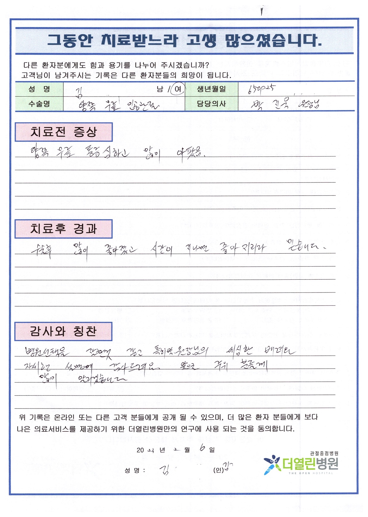 양측 무릎 인공관절치환술 페이지 정보 작성자 관리자 댓글 0건 조회 80회 작성일 23-03-04 11:56 본문 목록 이전글좌측 반월상연골절제술 23.03.04 다음글회전근개봉합술 23.03.04 댓글목록 댓글목록 등록된 댓글이 없습니다.